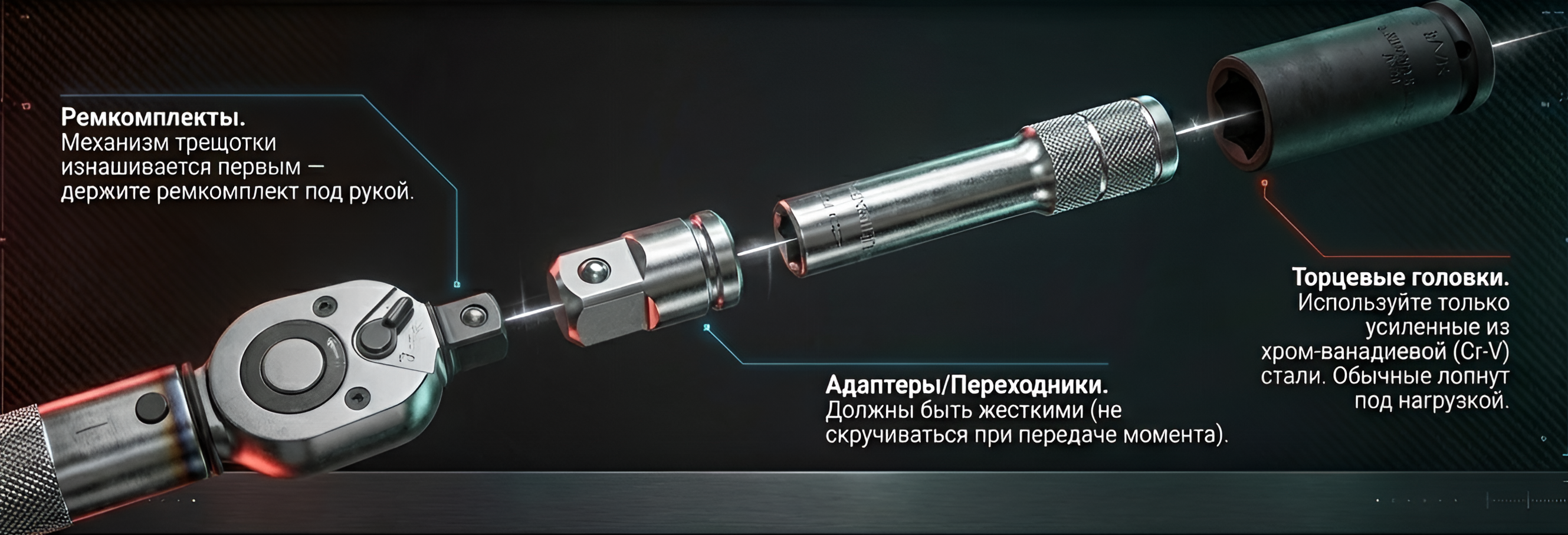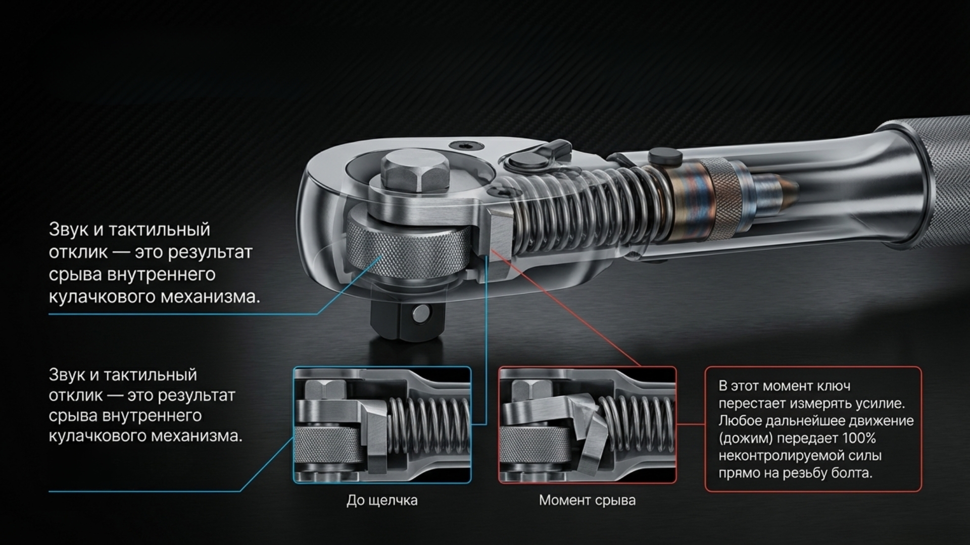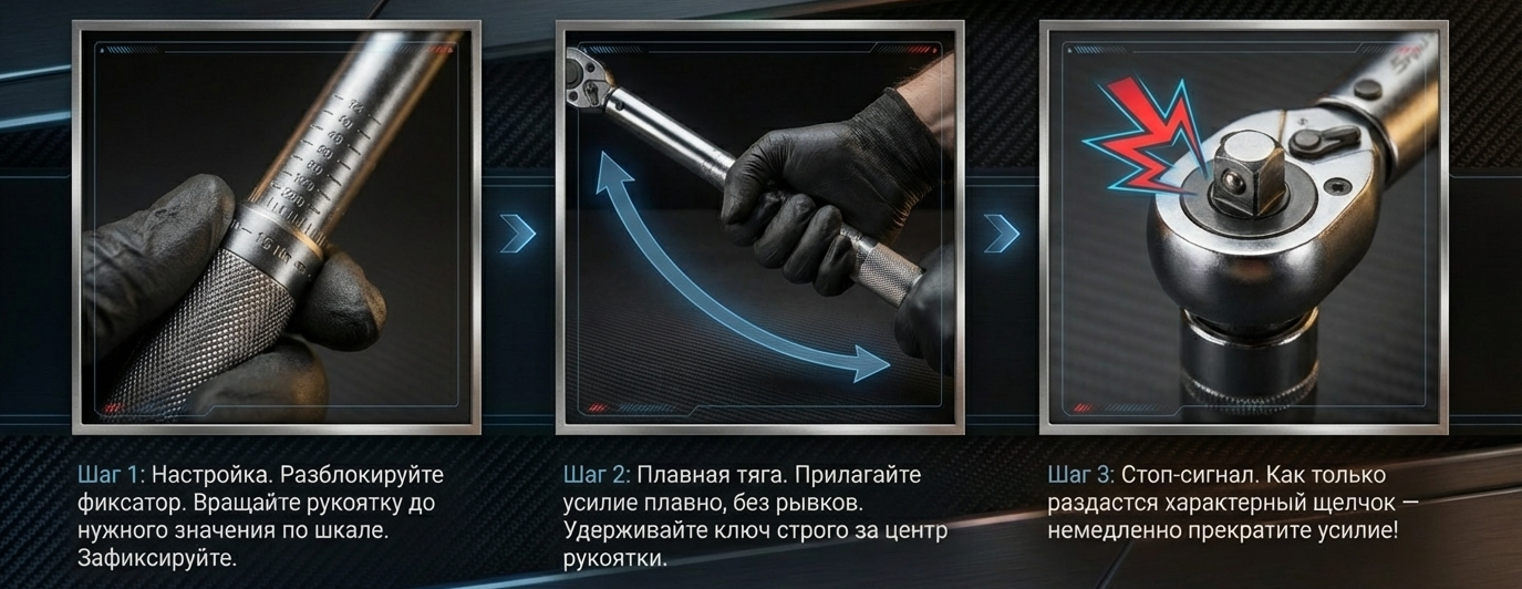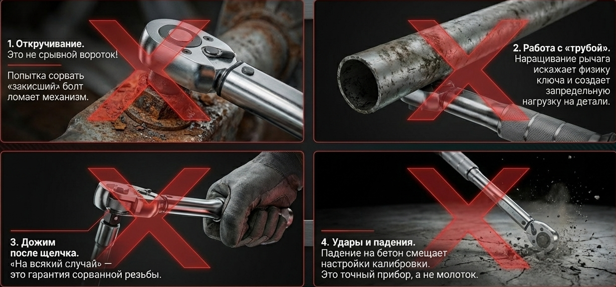 2. Игнорировать щелчок: Дожим «на всякий случай» после сигнала — самая частая причина сорванных резьб. Слышите щелчок — немедленно прекращайте усилие.