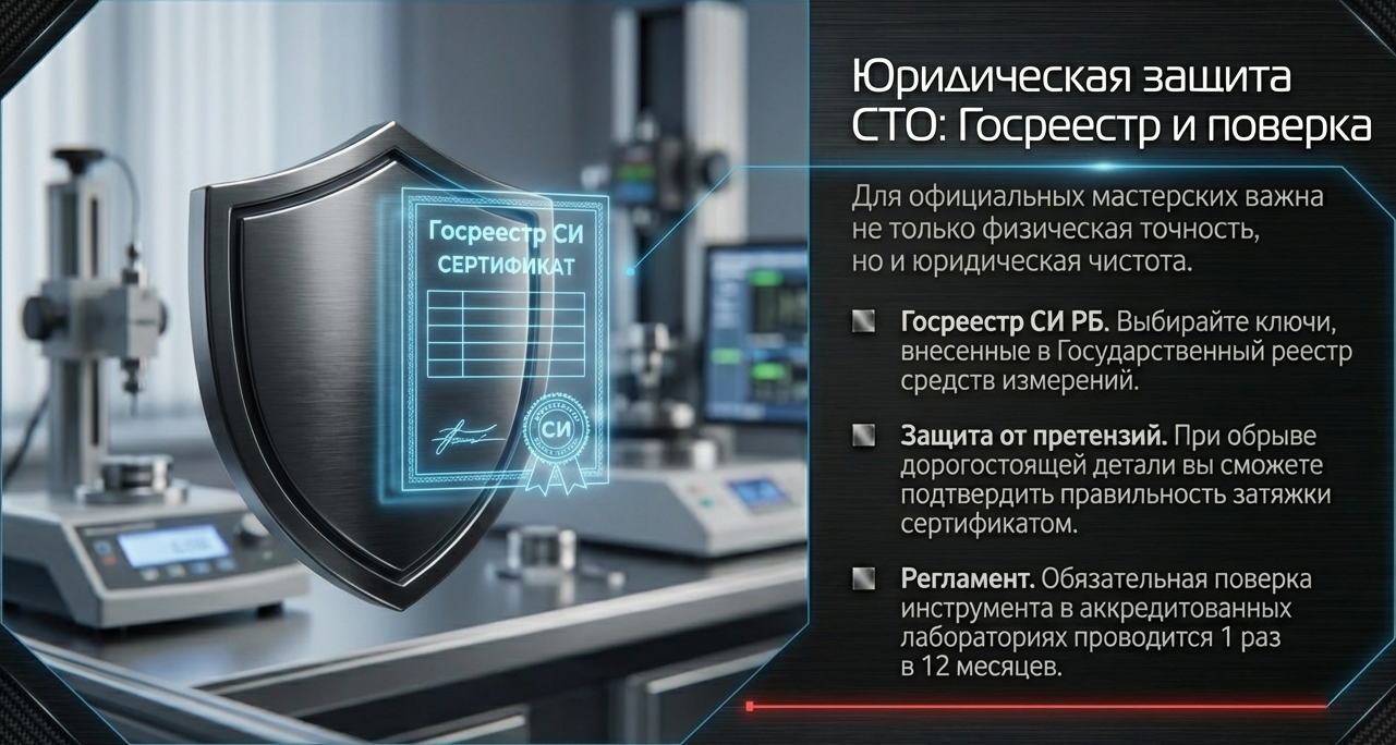 Зачем это нужно? При прохождении сертификации СТО или в спорных ситуациях с клиентами (например, при обрыве дорогостоящей детали) вы сможете подтвердить точность затяжки официальным свидетельством о поверке.