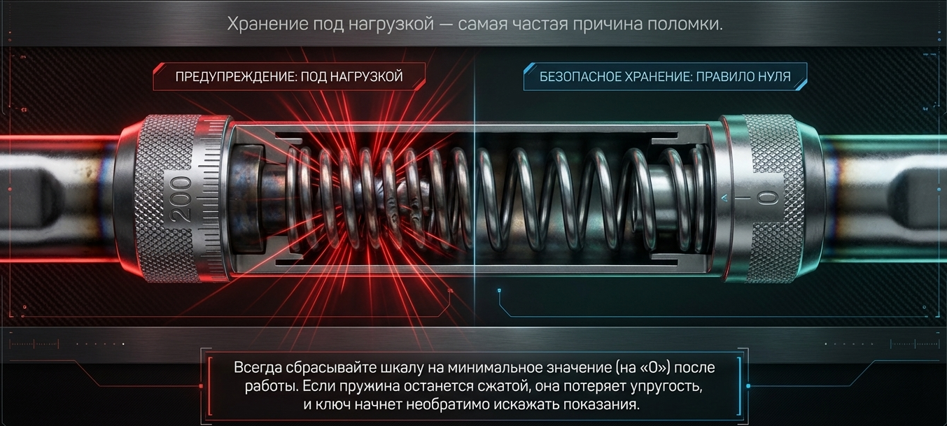 3. Хранить под нагрузкой: Самая опасная ошибка. После работы обязательно скрутите шкалу на минимальное значение. Если пружина внутри останется сжатой, она быстро потеряет упругость, и ключ начнет выдавать неверные данные.