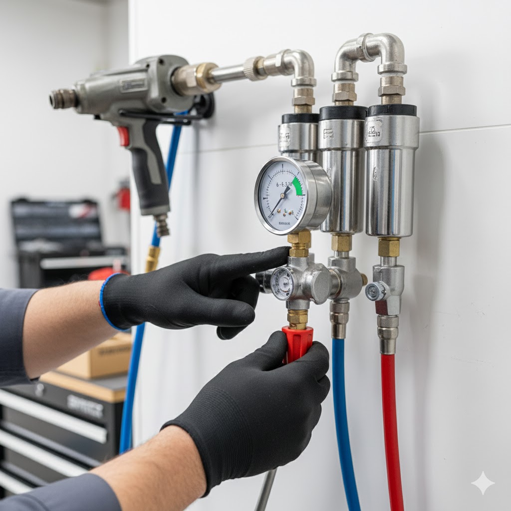 - Контролируйте давление: Используйте манометр и настройте редуктор в блоке подготовки воздуха на рекомендованное значение.