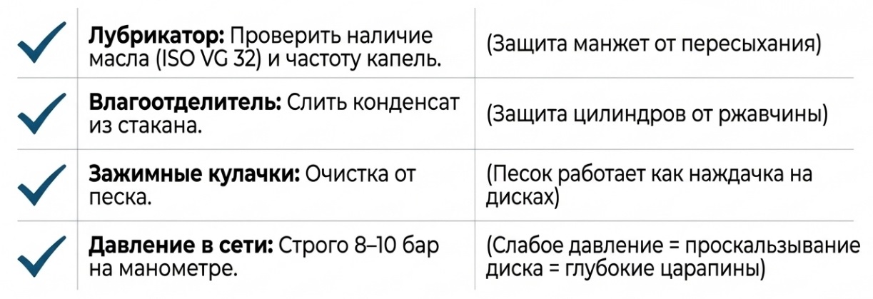 Скрытая коррозия: Если предыдущий владелец работал без влагоотделителя (а это случается часто), внутри воздушного цилиндра образуются раковины и каверны. Такой узел начнет «травить» воздух в самый разгар очереди, и ремонту он практически не подлежит. |