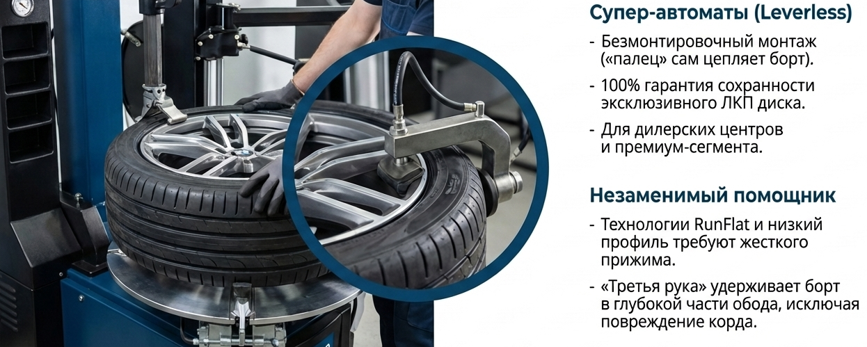 Актуальные стандарты: Новые станки изначально спроектированы под современные размеры дисков (до 24-28") и жесткую резину. |