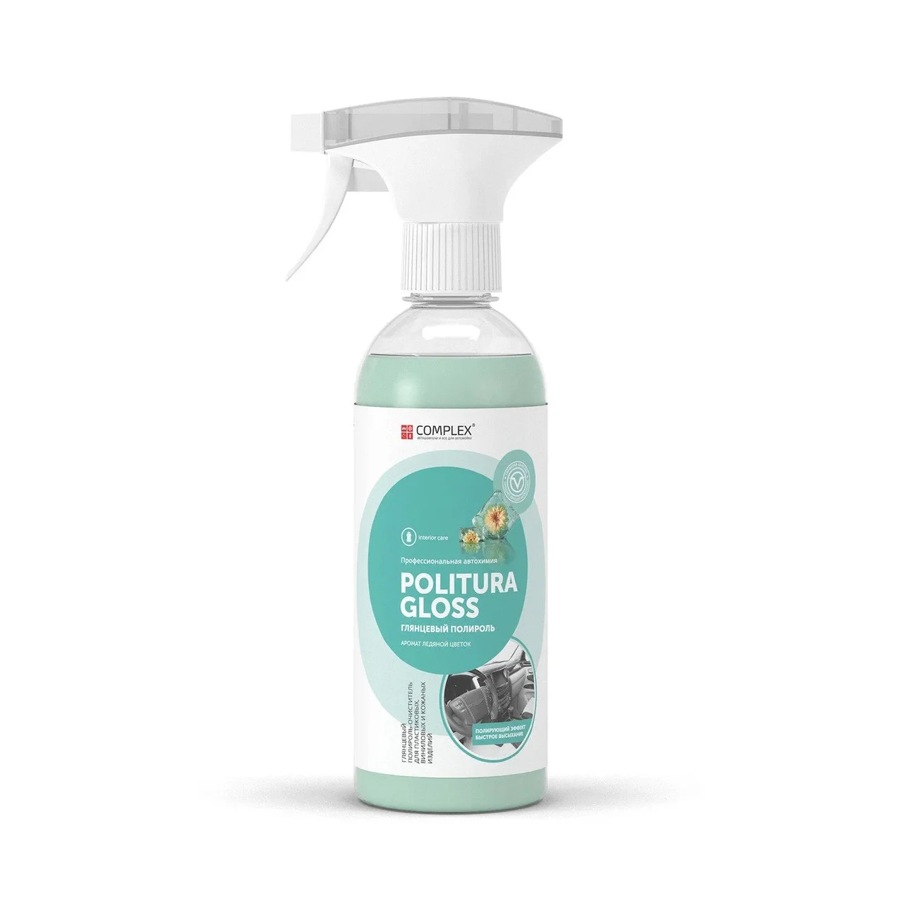 Глянцевый полироль для пластиковых, виниловых и кожаных изделий с ароматом ледяной цветок.