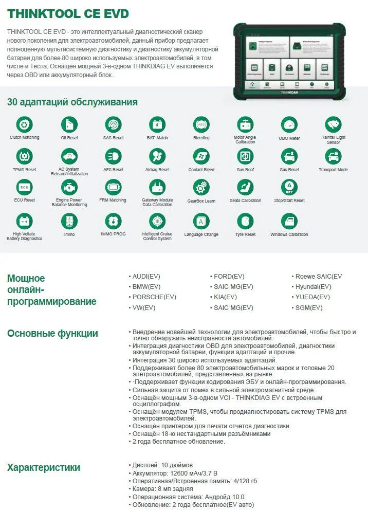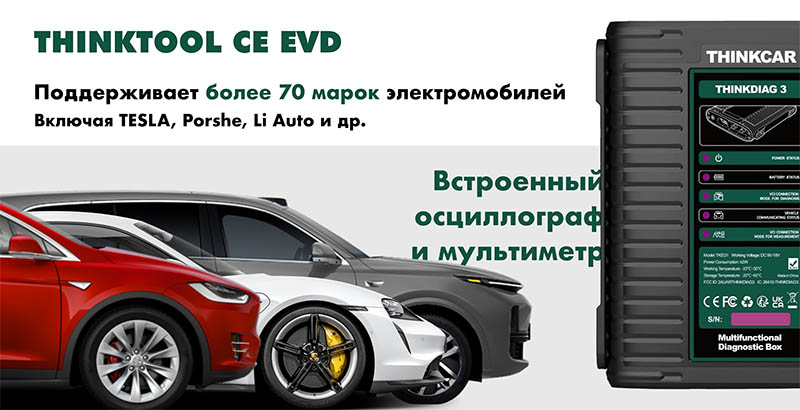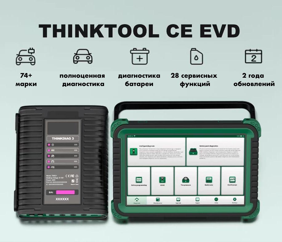 THINKTOOL CE EVD - диагностический сканер для работы с электромобилями. Данная модель поддерживает диагностику более 70 марок электрокаров, включая Tesla. Автосканер CE EVD разработан настоящими профессионалами в сфере автодиагностики и имеет как базовый, так и расширенный функционал для полноценной работы с электромобилями, включая кодирование и онлайн-программирование.