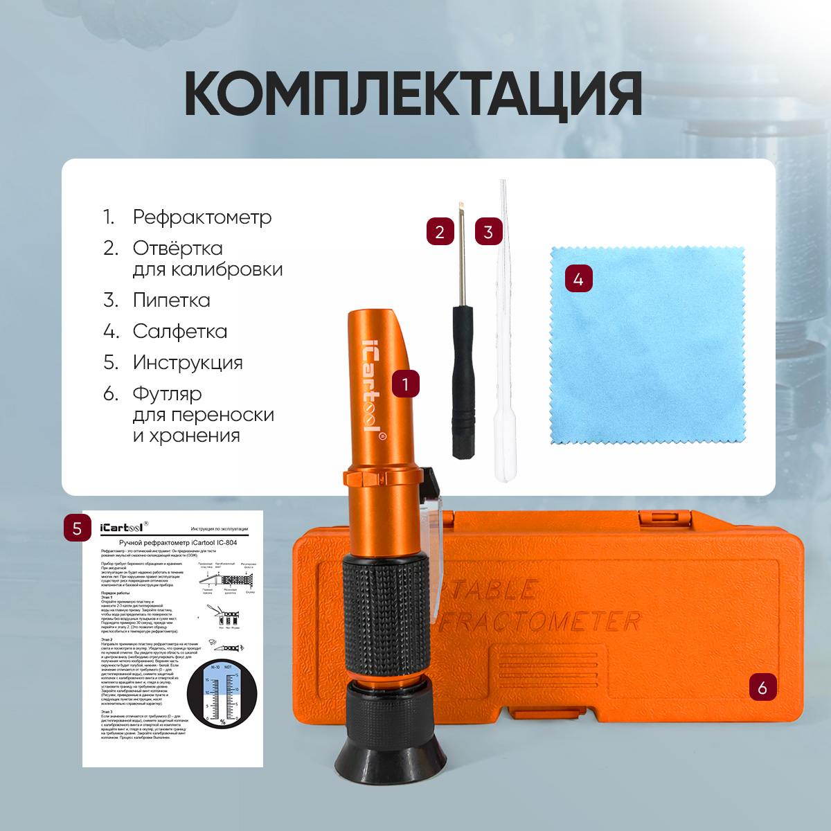 Рефрактометр СОЖ iCartool IC-804 — ручной оптический прибор для контроля концентрации смазочно-охлаждающих жидкостей (водосмешиваемых эмульсий) по принципу преломления света. Он помогает быстро оценить состояние СОЖ на производстве, понять, насколько корректно приготовлена эмульсия, и вовремя заметить ухудшение её свойств.