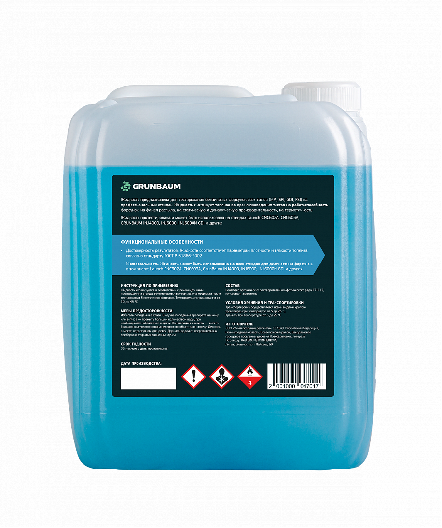 GRUNBAUM INJ100 - специализированная жидкость, которая имитирует топливо во время проведения тестов, что позволяет оценить основные рабочие характеристики форсунок, такие как: