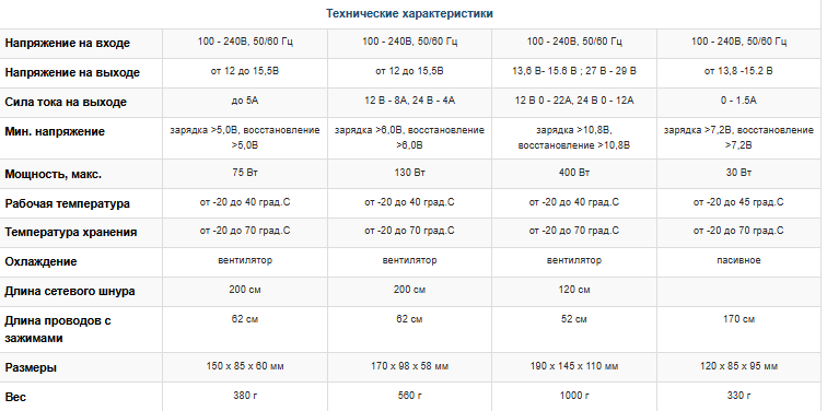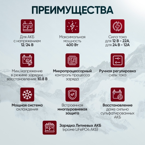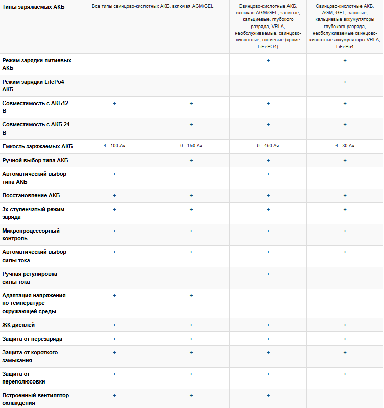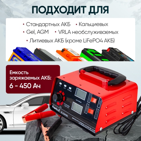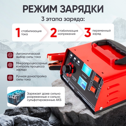Зарядка АКБ – осуществляется в 3 этапа: стабилизация тока, стабилизация напряжения, переменный заряд. Благодаря микропроцессорному контролю зарядное устройство автоматически подбирает необходимую для заряда АКБ силу тока и продолжительность зарядки, а также адаптирует напряжение в зависимости от температуры электролита в соответствии с выбранным типом АКБ. Это позволяет эффективно зарядить даже сильно разряженную АКБ, но при этом избежать перезарядки и перегрева АКБ, а также ее преждевременного износа или выхода из строя из-за некорректно выбранных параметров для зарядки.