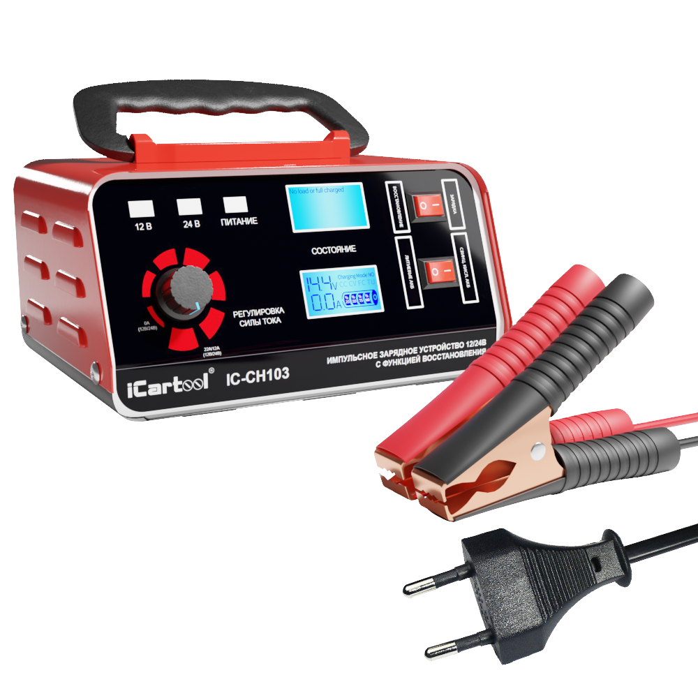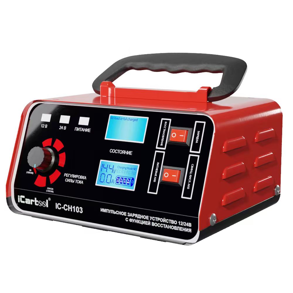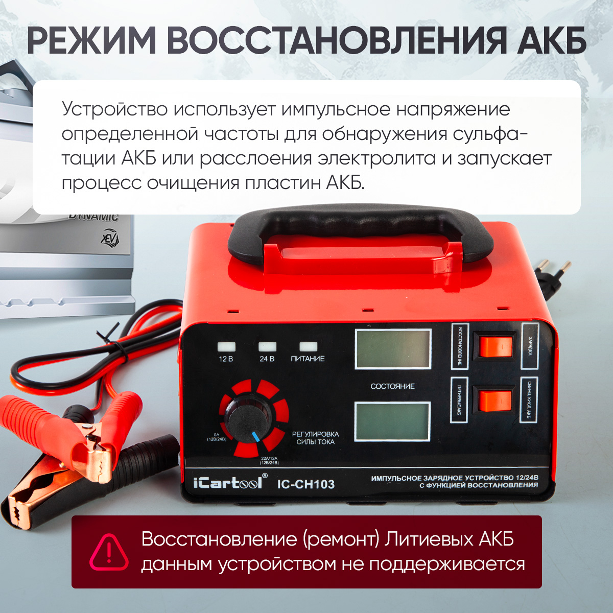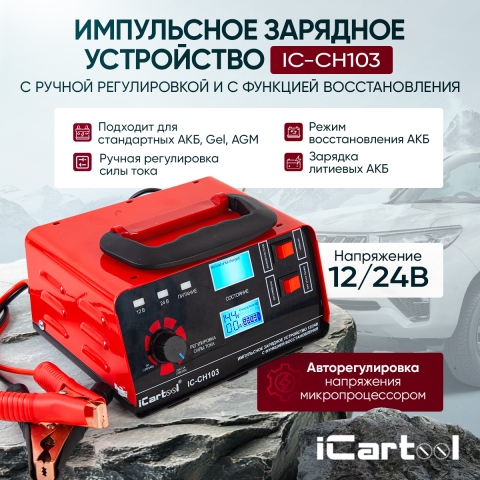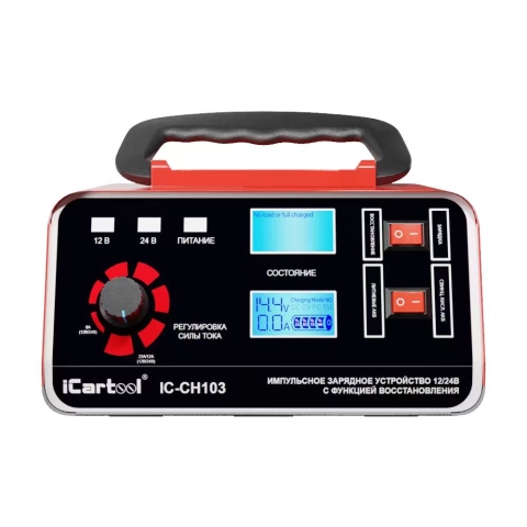 Автоматическое импульсное устройство 2 в 1 iCartool IC-CH103 Предназначено для заряда и восстановления всех типов свинцово-кислотных аккумуляторных батарей (АКБ) 12В/24В, включая АКБ типов AGM/GEL а так же, залитых, кальциевых аккумуляторов глубокого разряда, VRLA, необслуживаемых свинцово-кислотных аккумуляторов. Отличительной особенностью является возможность производить зарядку литиевых (кроме LiFePO4) АКБ.