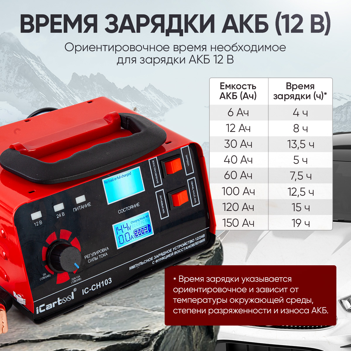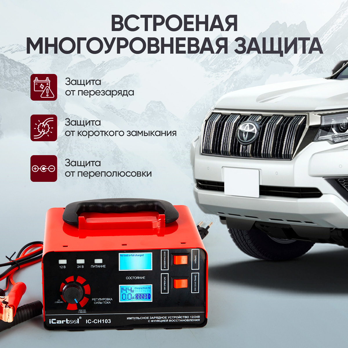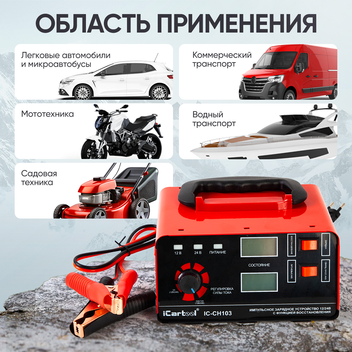 Автоматическое импульсное устройство 2 в 1 iCartool IC-CH103 Предназначено для заряда и восстановления всех типов свинцово-кислотных аккумуляторных батарей (АКБ) 12В/24В, включая АКБ типов AGM/GEL а так же, залитых, кальциевых аккумуляторов глубокого разряда, VRLA, необслуживаемых свинцово-кислотных аккумуляторов. Отличительной особенностью является возможность производить зарядку литиевых (кроме LiFePO4) АКБ.
