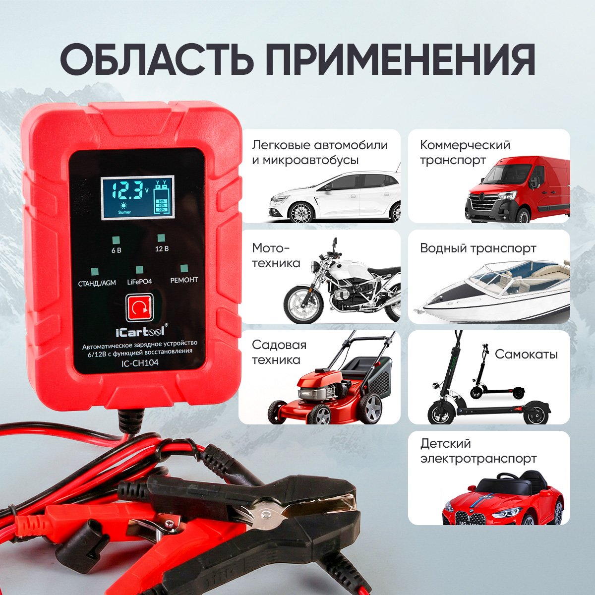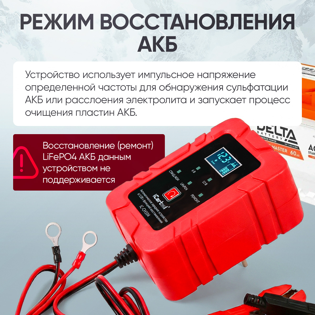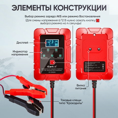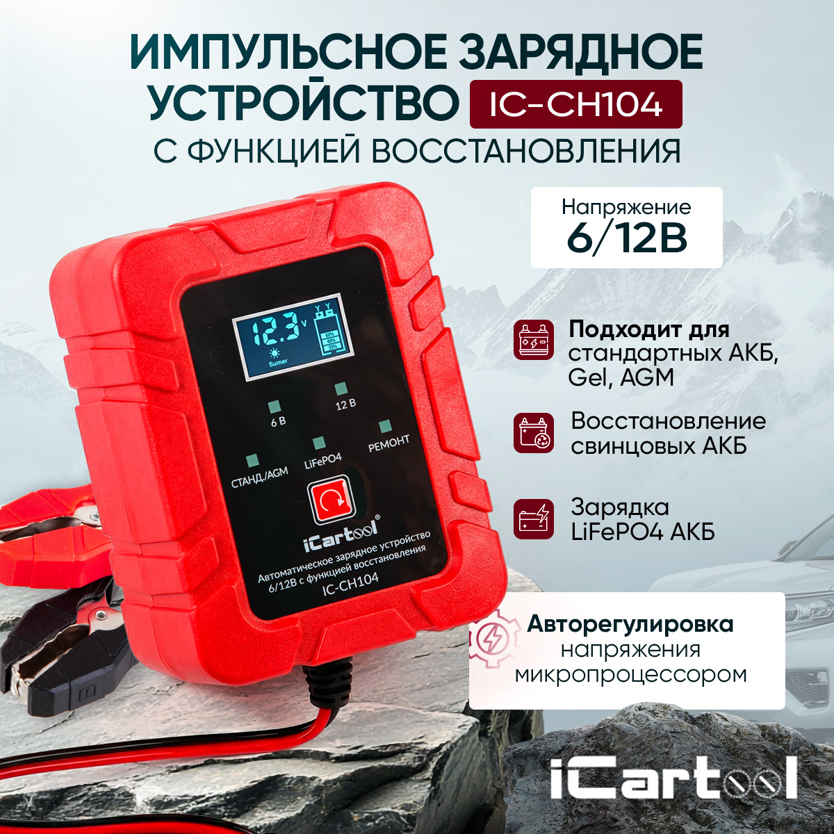 Автоматическое импульсное устройство 2 в 1 iCartool IC-CH104 предназначено для заряда и восстановления всех типов свинцово-кислотных аккумуляторных батарей (АКБ) 6В/12В, включая АКБ типов AGM/GEL а так же, залитых, кальциевых аккумуляторов глубокого разряда, VRLA, LiFePO4 АКБ.