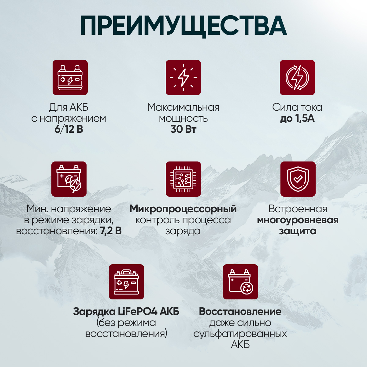 Зарядка АКБ – осуществляется в 7 этапов: Десульфация аккумулятора, Плавный пуск заряда, Объемная зарядка, Абсорбционная зарядка, Тестирование аккумулятора, Восстановительная зарядка, Режим поддержания заряда. Благодаря микропроцессорному контролю зарядное устройство автоматически подбирает необходимую для заряда АКБ силу тока и продолжительность зарядки, а также адаптирует напряжение в зависимости от температуры электролита в соответствии с выбранным типом АКБ. Это позволяет эффективно зарядить даже сильно разряженную АКБ, но при этом избежать перезарядки и перегрева АКБ, а также ее преждевременного износа или выхода из строя из-за некорректно выбранных параметров для зарядки.