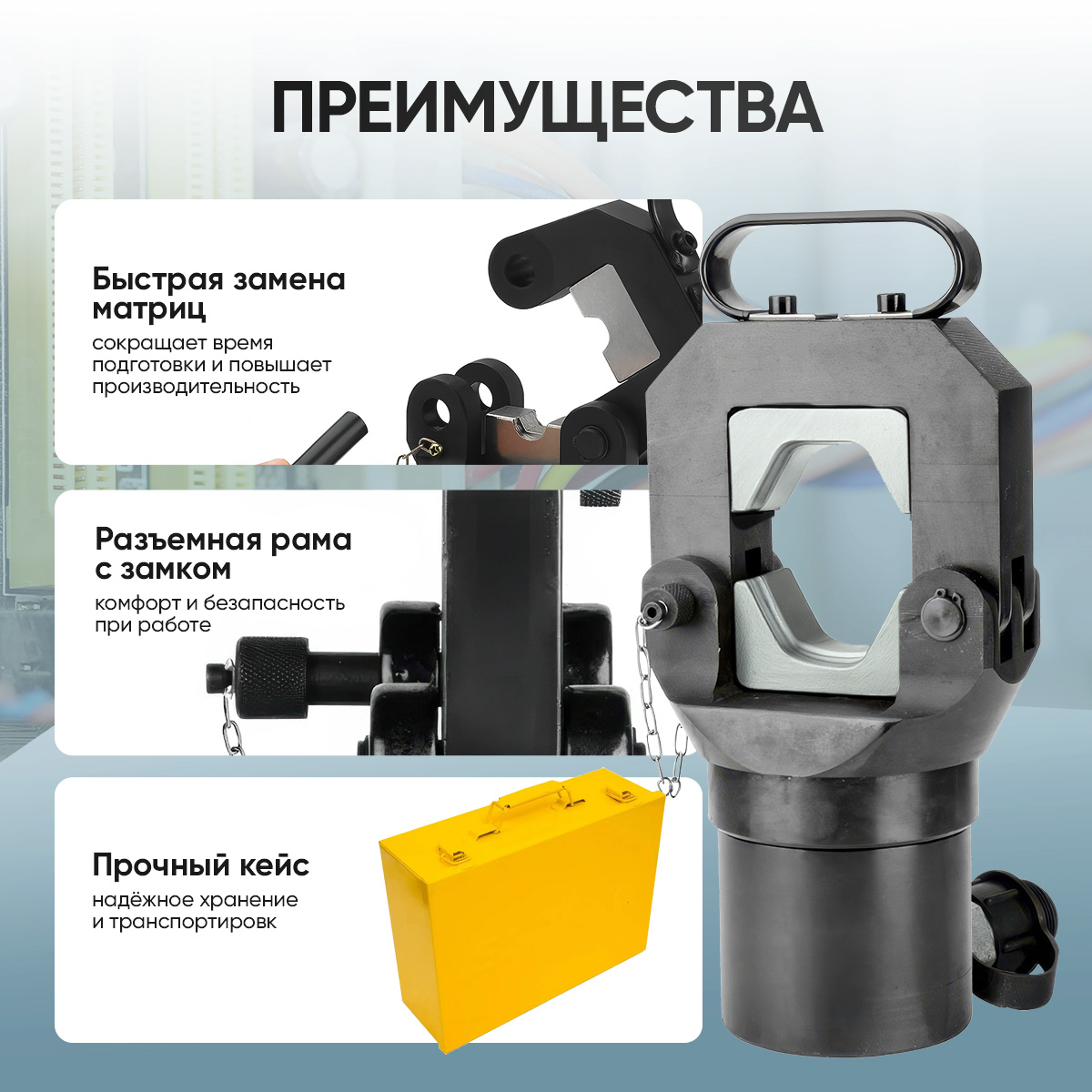 Профессиональная неавтономная гидравлическая обжимная головка для прессовки медных и алюминиевых наконечников/гильз 150–630 мм² и аппаратных зажимов. Работает от внешнего насоса/гидростанции. Идеальна для энергетики, промышленного электромонтажа и сборки щитового оборудования, где требуются крупные сечения и стабильное качество соединения.