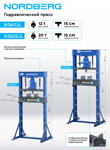 NORDBERG N3611JL — прочный и надёжный гидравлический пресс, сочетающий усилие, удобство в эксплуатации и компактность, что делает его отличным выбором для автосервисов и ремонтных мастерских. Используется на СТО, в мастерских и производственных цехах.