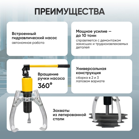 Оборудован выносным гидравлическим насосом, что значительно повышает удобство в эксплуатации, особенно в труднодоступных зонах. Благодаря продуманной конструкции и прочным материалам, инструмент выдерживает нагрузки до 10 тонн, обеспечивая безопасную и эффективную работу в автосервисах, на производстве и в тяжелой промышленности.