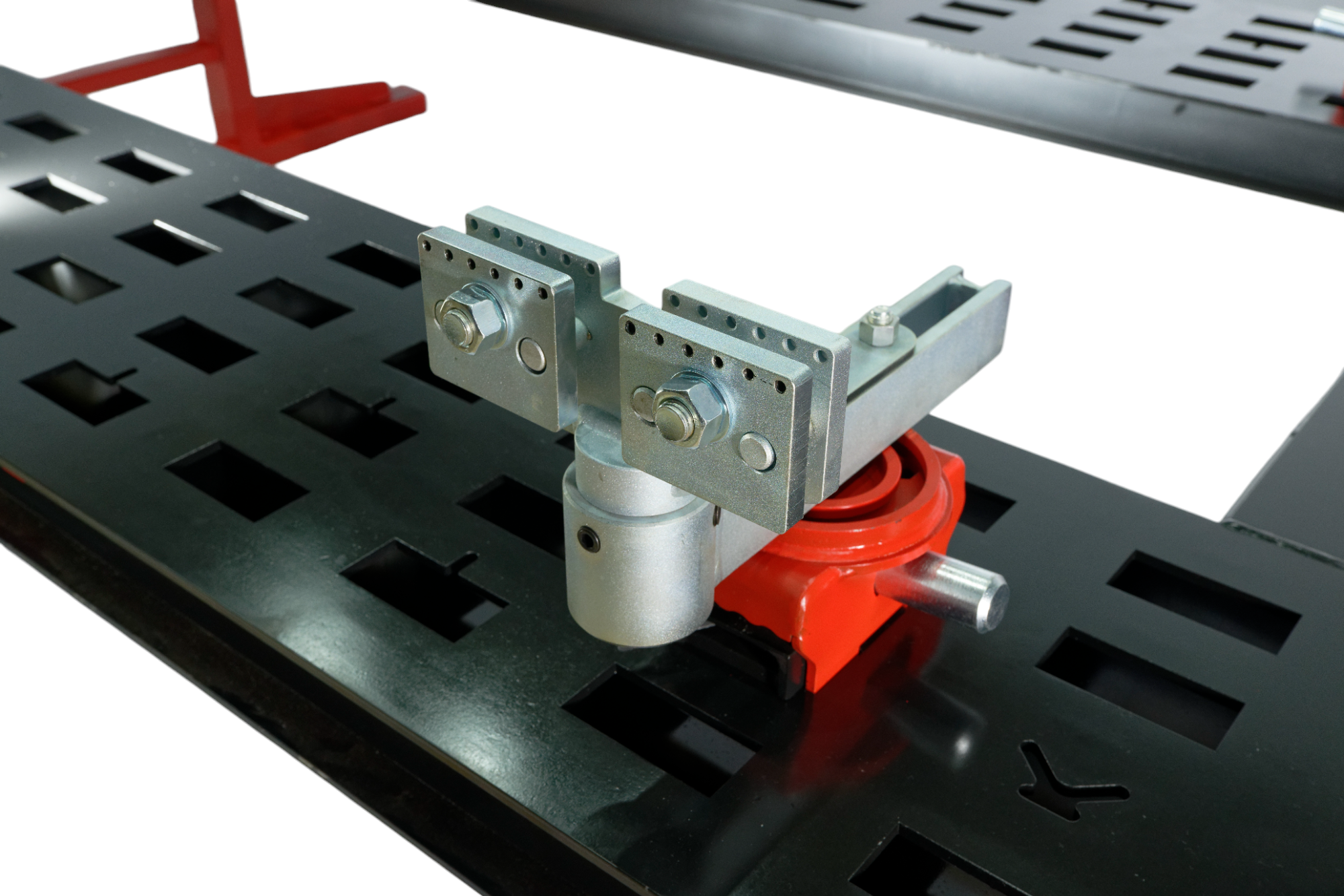 Уникальная, опорно-поворотная система фиксации обеспечивает быстрое и надёжное закрепление автомобиля к платформе с помощью клина.