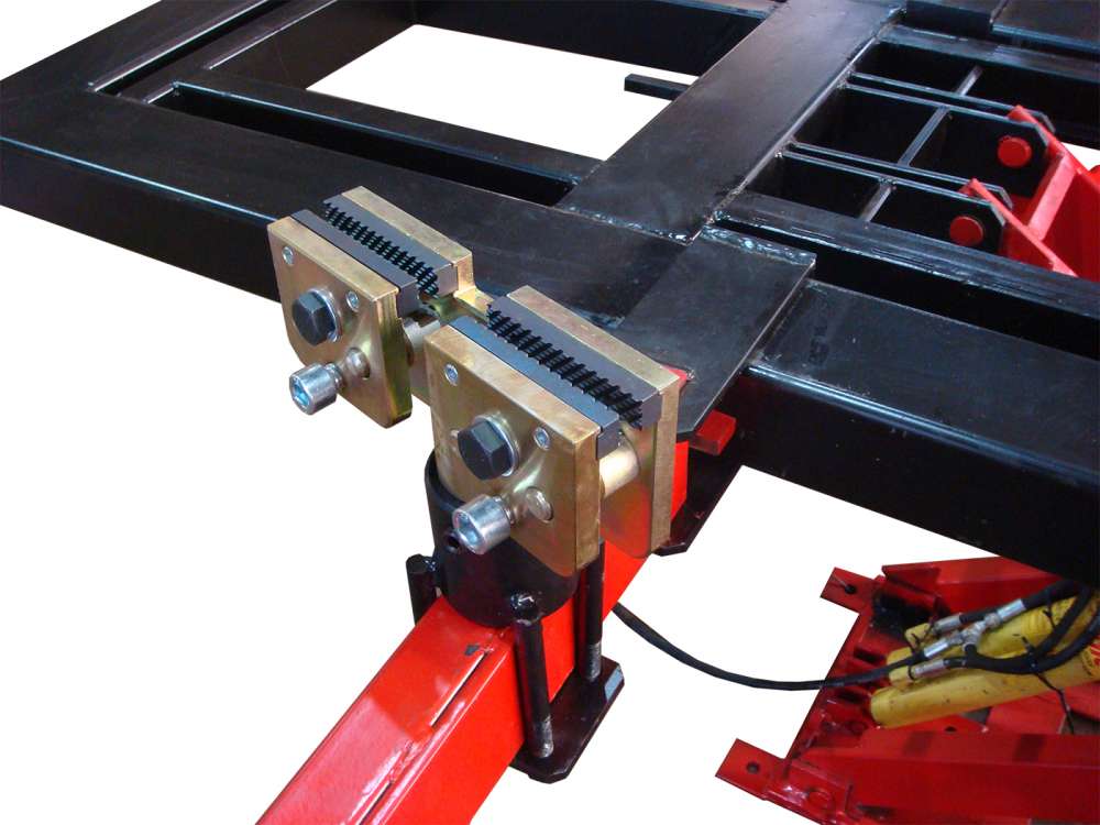 Усиленные зажимы за отбортовку порогов имеют оригинальную конструкцию разработанную с учетом устранения эффекта сползания и срыва. Узел сопряжения зажима со стойкой фиксации позволяет закрепить автомобиль с искривленной геометрией порогов не ограничивая дальнейших перемещений детали кузова в плоскости и одновременно удерживать его в момент исправления. Конструкция зажимов не имеет аналогов и разработана с учетом опыта и пожеланий российских мастеров кузовного дела.