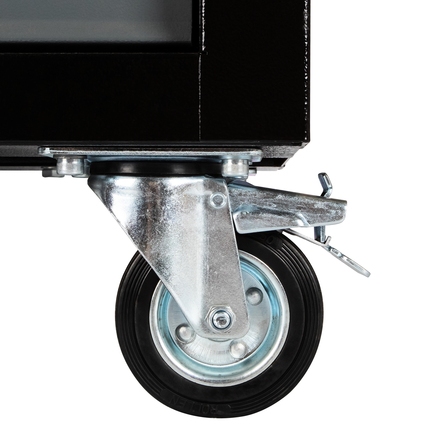 Каждое колесо выдерживает нагрузку до 85 кг. Материал устойчив к агрессивным материалам — маслу и бензину. Благодаря диаметру в 100 мм колёсики легко преодолевают небольшие выбоины, ямы, технические трещины на полу. Функциональная и рабочая система блокировки обеспечивает фиксацию тележки на месте.