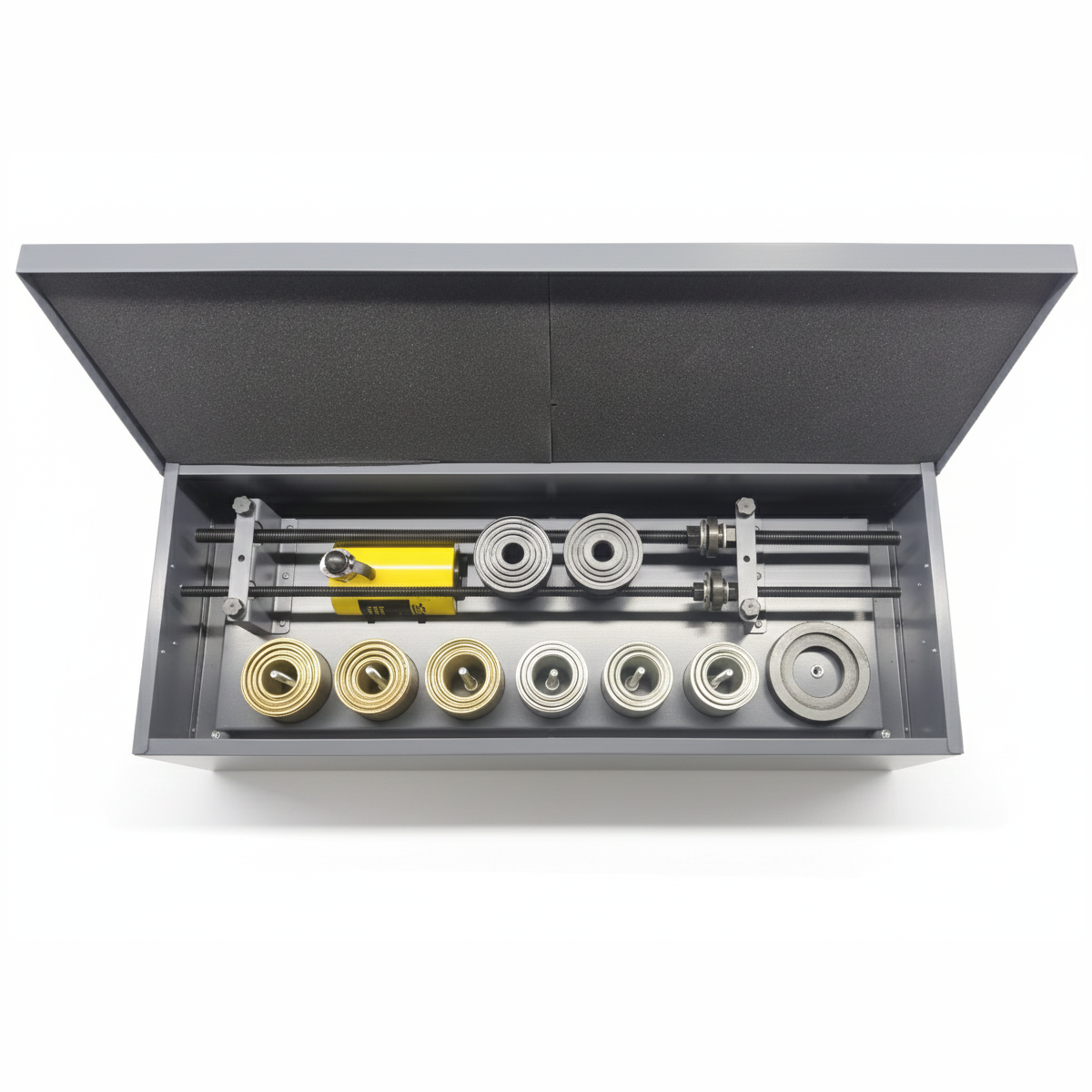 - Набор упорных стаканов и торцевых пластин A/B — подстройка под разные диаметры, контроль соосности при работе;