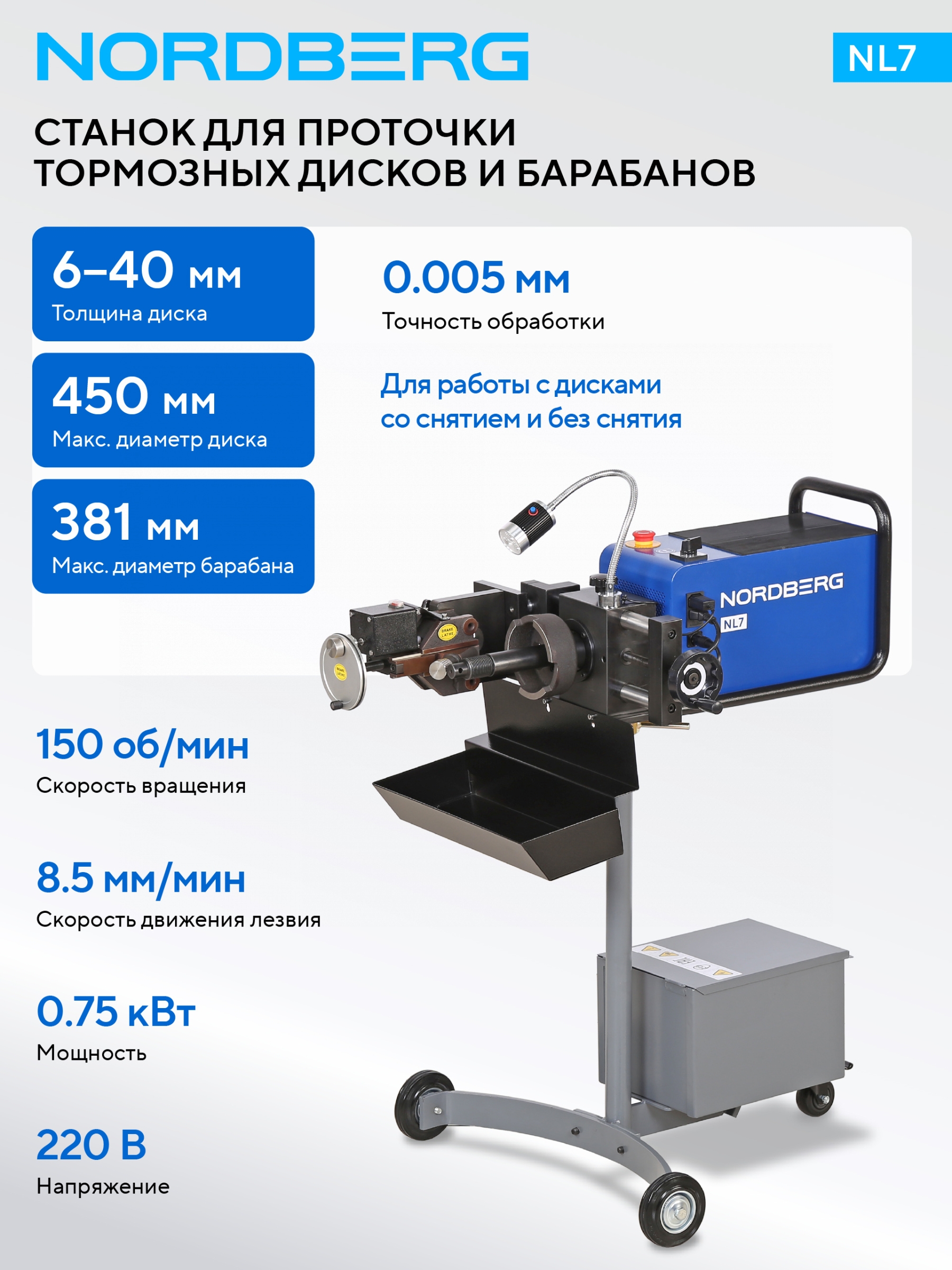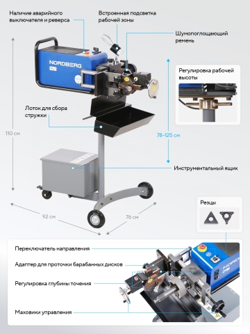 NORDBERG NL7 — cтанок предназначен для высокоточной проточки тормозных дисков и барабанов с целью устранения дефектов, вызванных износом, трением и температурными деформациями. Позволяет проводить обработку как непосредственно на автомобиле, так и с отдельно снятыми деталями, восстанавливая рабочую поверхность, прилегающую к колодкам, и обеспечивая оптимальный контакт для эффективного торможения.