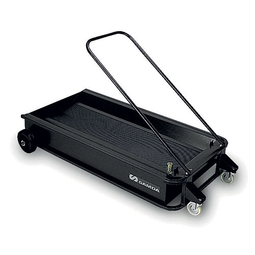 Низкопрофильная подкатная ванна предназначена для опорожнения самотеком через спускной кран или с помощью комплекта с насосом для откачки (номер детали 559100) через сухоразъемный гидравлический соединитель (номер детали 950 352) (не входит в комплект поставки). Ванна объемом 95 л (25 галлона США) для пассажирских автомобилей и небольших фургонов.