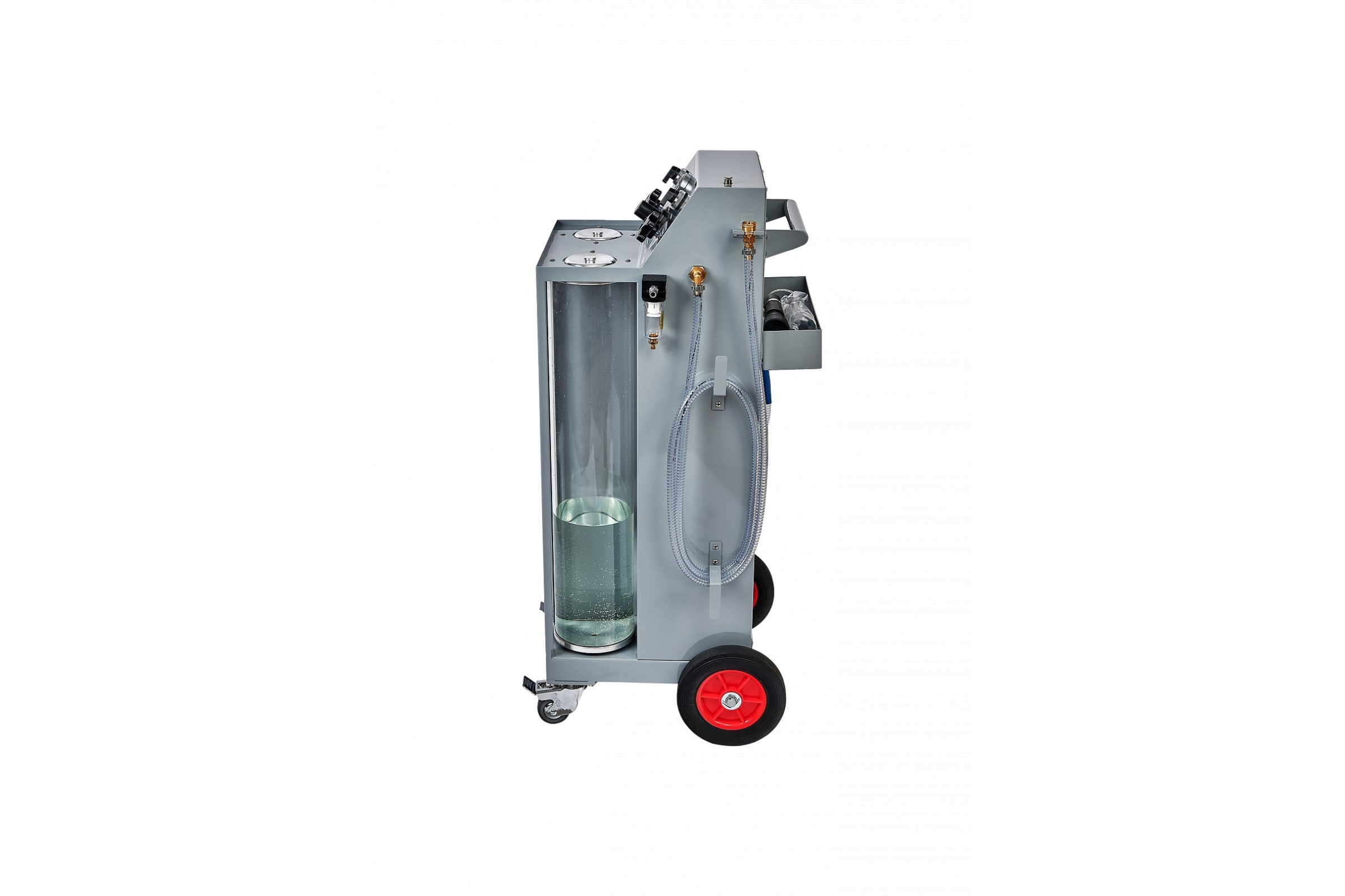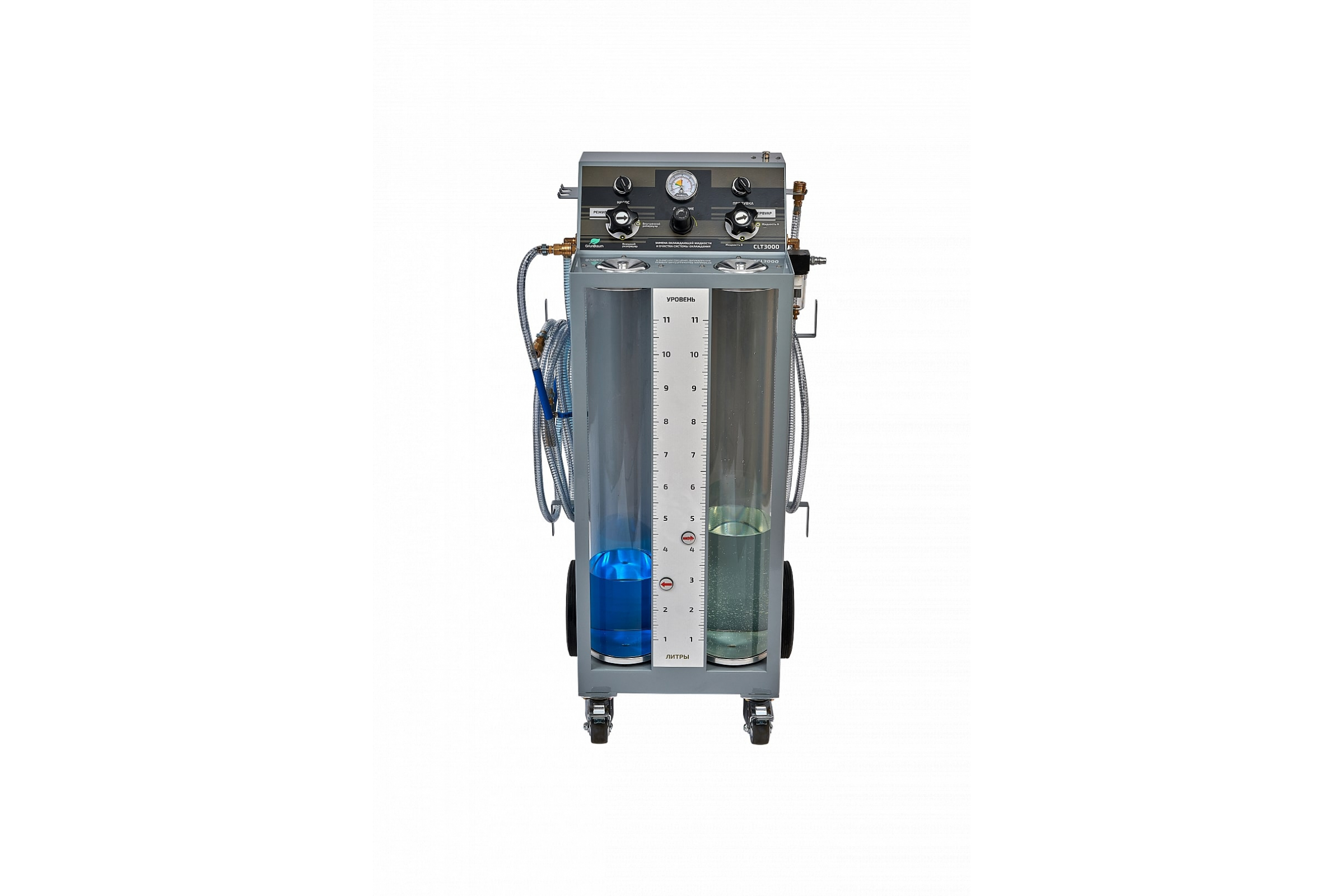Установка для замены антифриза без подъемника на холодном ДВС с применением двух технологий работы – стандартной и специального решения от GrunBaum. В отличие от других установок CLT3000 позволяет заменить антифриз на заглушенном двигателе путем вытеснения и экономит в два раза больше охлаждающей жидкости.