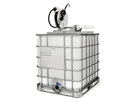 Комплект с насосом для масла 3:1 с катушкой для контейнеров 1000 л, монтаж сверху. В комплект входит всасывающий шланг для нижнего выходного отверстия контейнера.