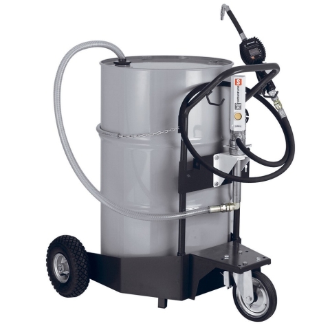 Мобильный маслораздатчик с насосом Pumpmaster 3:1 для бочек 205 л. Насос монтирован на тележке, упрощает замену пустой бочки.