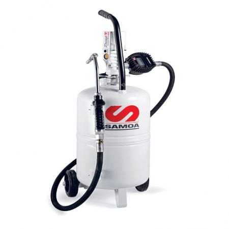 Маслораздатчик с пневматическим приводом с расходомером, 25 литров. Автономная установка со стальной емкостью 25 л (6,6 галлона США) и датчиком уровня. Установка включает в себя пневмонасос с коэффициентом сжатия 2:1, специально разработанный для раздачи высоковязких смазочных материалов, цифровой расходомер на выходе насоса и подающий шланг длиной 1,5 м с пистолетом для раздачи масла с безкапельной насадкой.