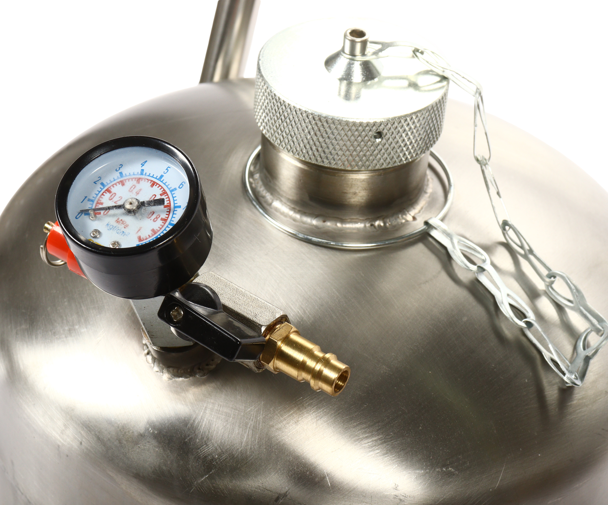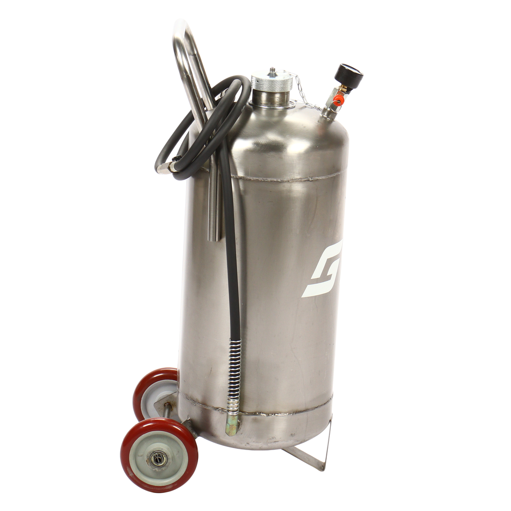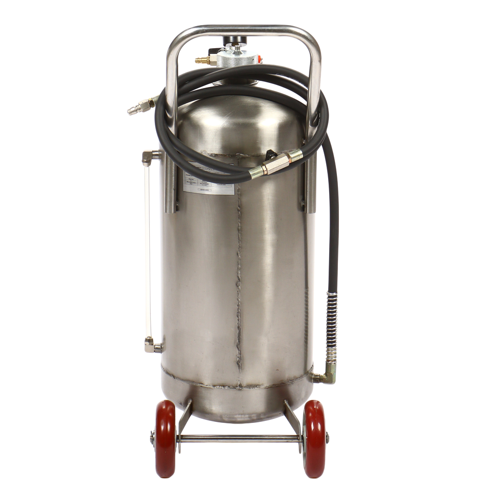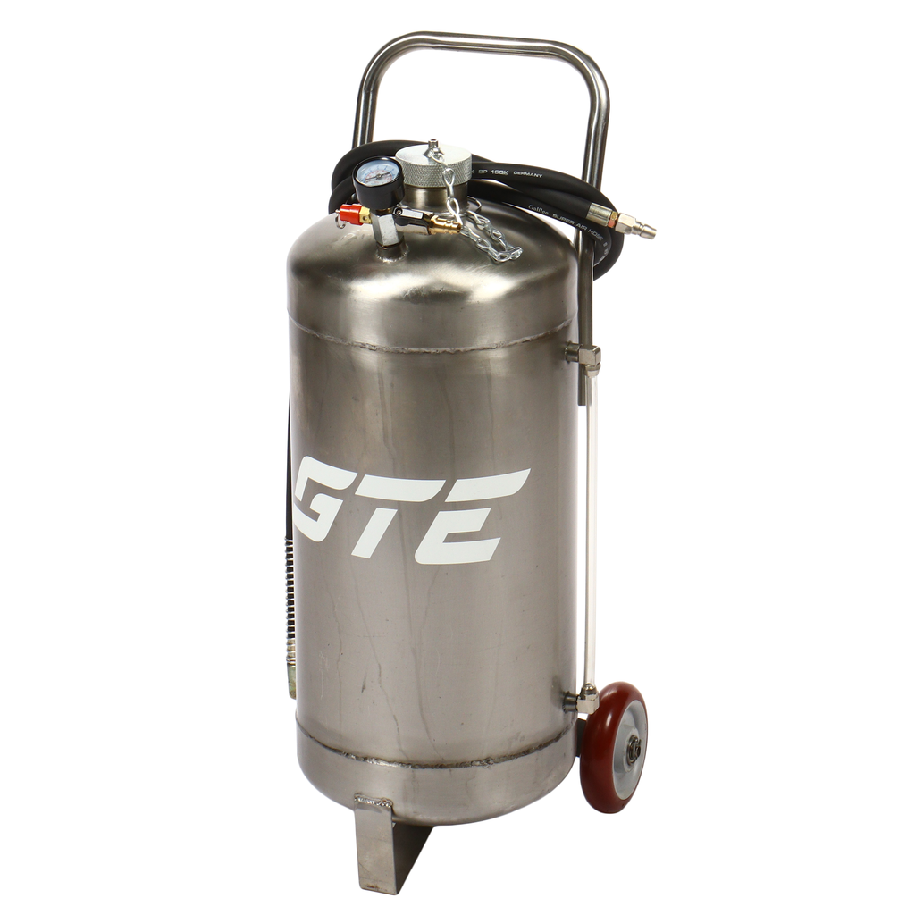 Пневматическая установка для подачи масла GTE-T14104 представляет собой стальную емкость объемом 24 л, c ручкой для удобства перемещения в помещении автосервиса, оборудована пневматическим насосом, благодаря которому создается давление, необходимое для подачи масла и сходных материалов.