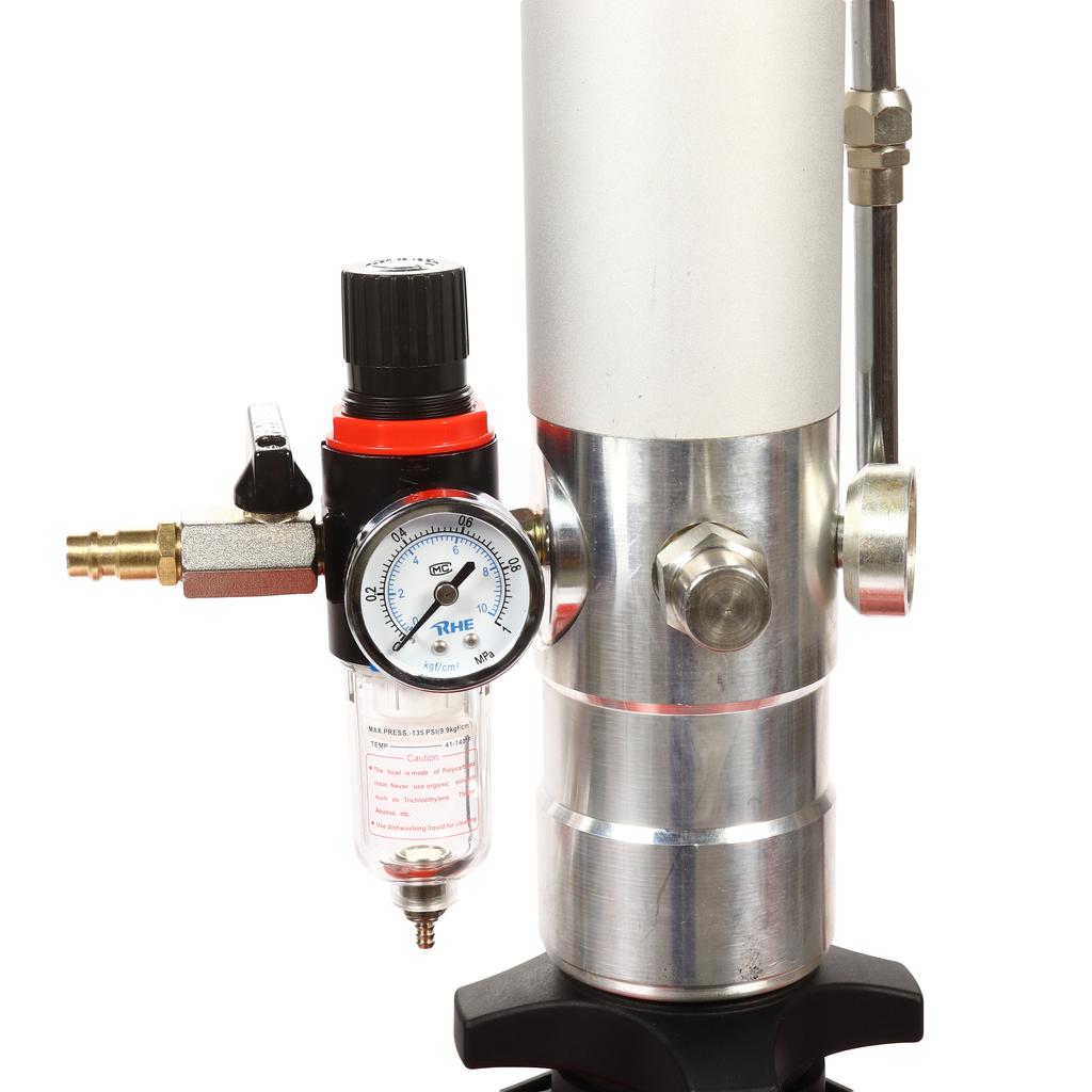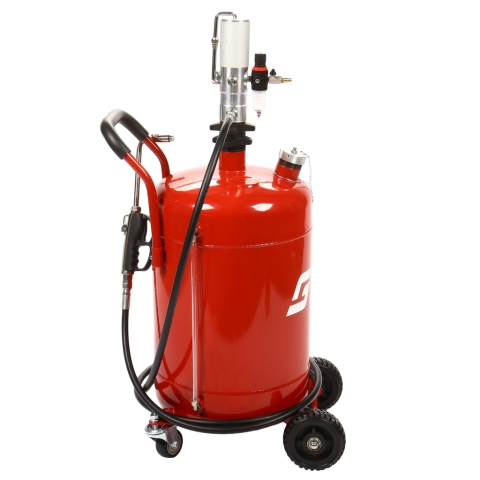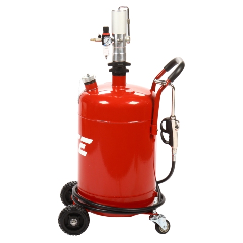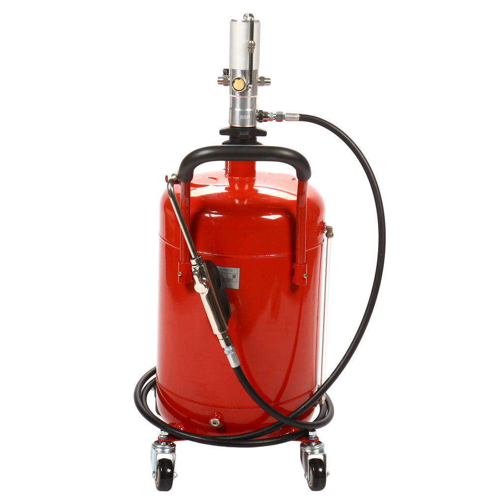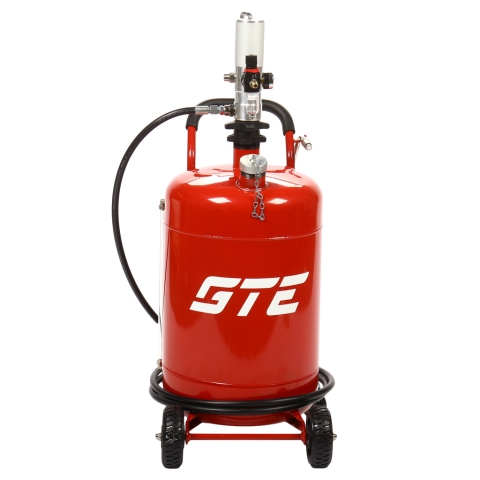 Пневматическая установка для подачи масла GTE-T14105 представляет собой стальную емкость объемом 70 л, c ручкой для удобства перемещения в помещении автосервиса, оборудована пневматическим насосом, благодаря которому создается давление, необходимое для подачи масла и сходных материалов.