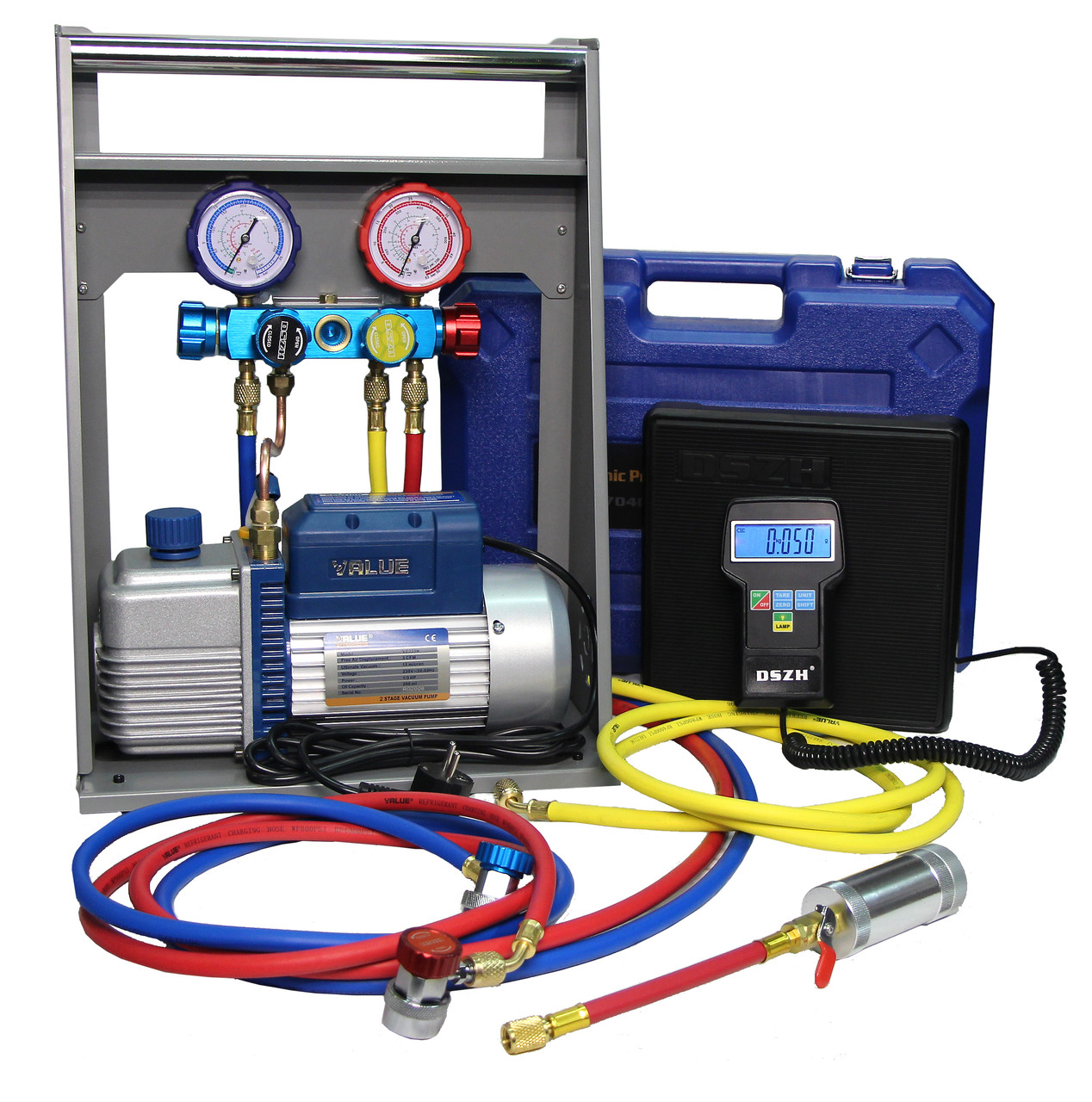 - Четырёхвентильный манометрический коллектор с смотровым окном;
