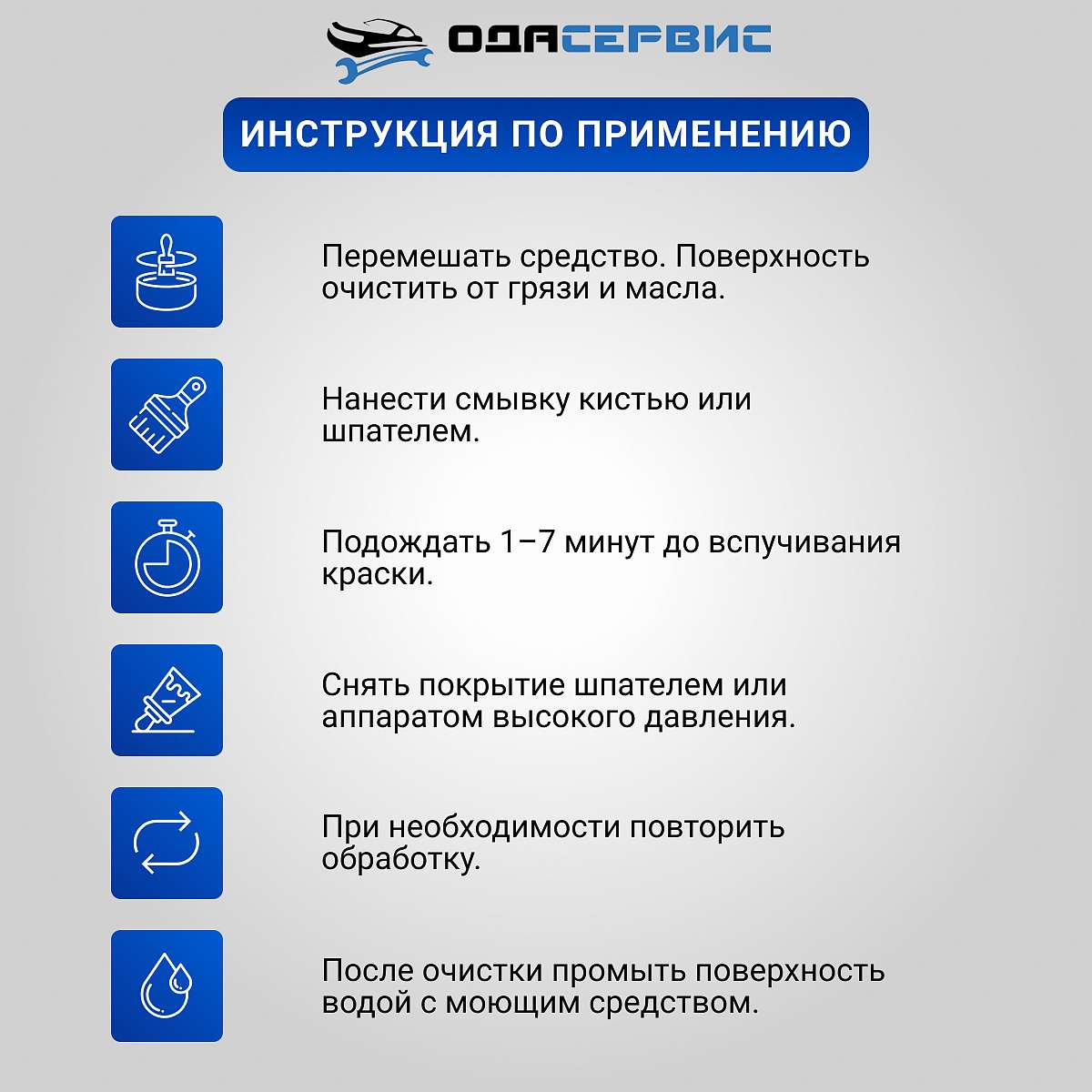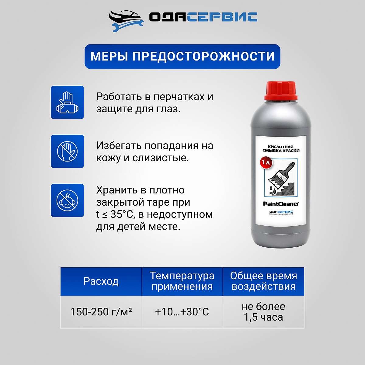 Кислотная смывка краски Paint Cleaner 1л ODA-Сервис ODA-26508 – профессиональное средство для быстрого удаления лакокрасочных покрытий. Эффективно справляется с эпоксидными, полиуретановыми и порошковыми красками на металле, бетоне, кирпиче и дереве. Подходит для автомастерских, стройки и производства.