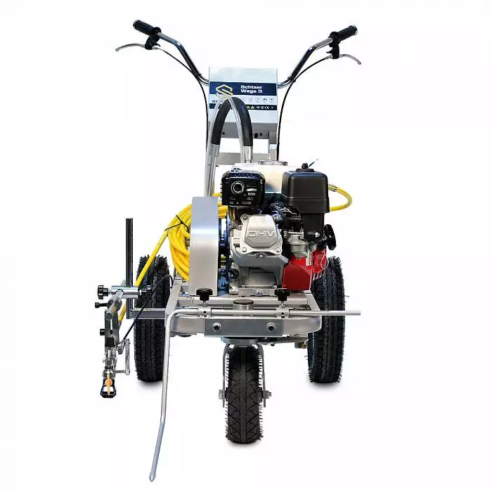 Schtaer Wega 3 - машина для распыления дорожной разметки краской. Разметочная машина с одним краскопультом предназначена для нанесения сплошных и прерывистых линий краской на дорогу, разметки пешеходников, нанесения дорожных знаков и надписей на дорогу, разметки парковок мест около магазинов и выставочных залов, разметки спортивных площадок и футбольных полей. Разметочную машину можно использовать только с краской, пригодной для безвоздушного распыления. Также машину можно использовать для разметки дорожных бордюров, мостовых конструкций, столбов фонарного освещения, можно также ее использовать как бензиновый окрасочный агрегат и красить фасады зданий и бетонные заборы. Максимальная длина шланга 90 метров. Сопло 1908.