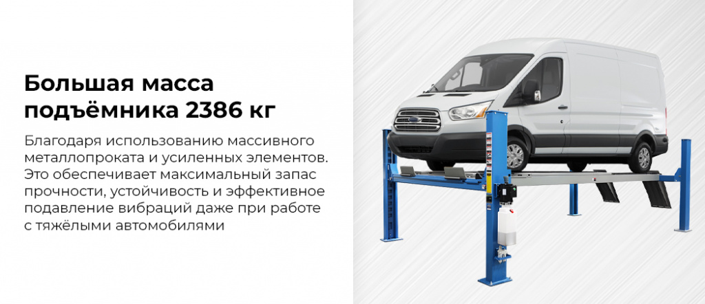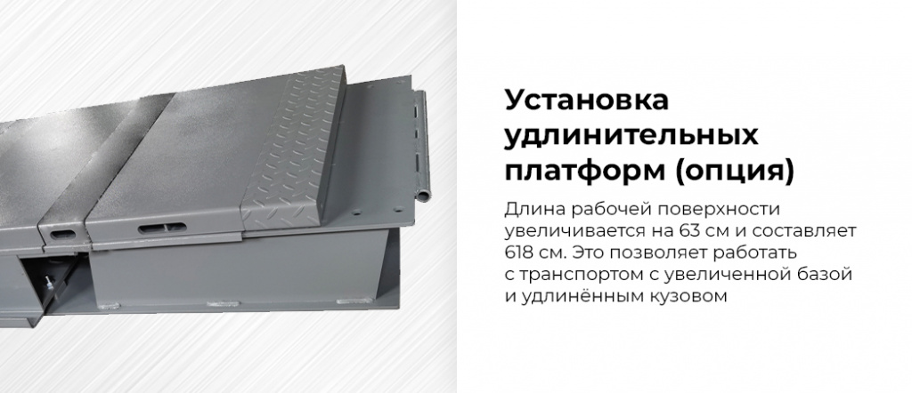 Подъёмник предназначен для диагностики, ремонта и регулировки углов установки колёс. Позволяет обслуживать автомобили с любой колесной базой — от компактных малолитражек до длиннобазных легковых автомобилей и легкого коммерческого транспорта.