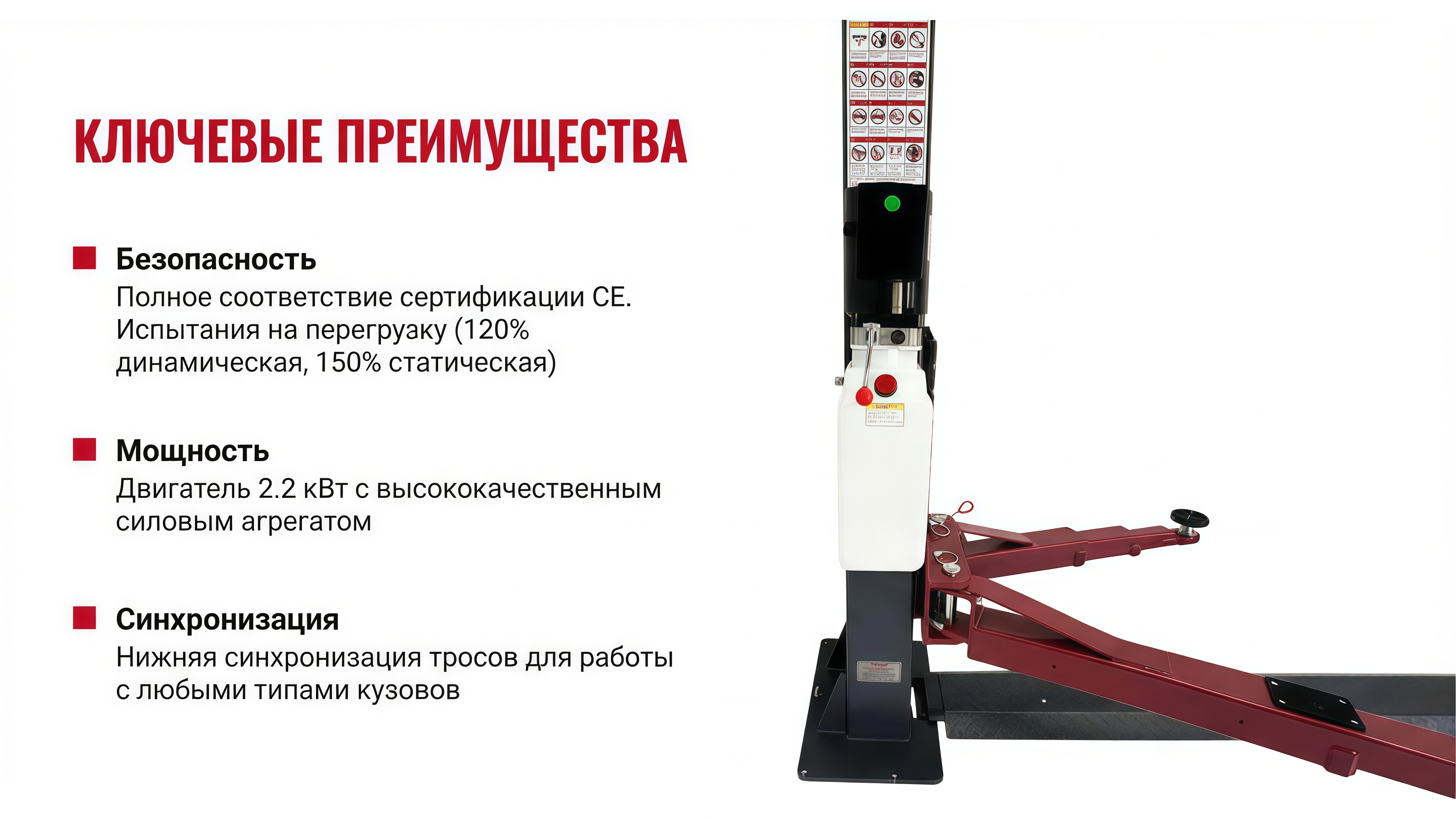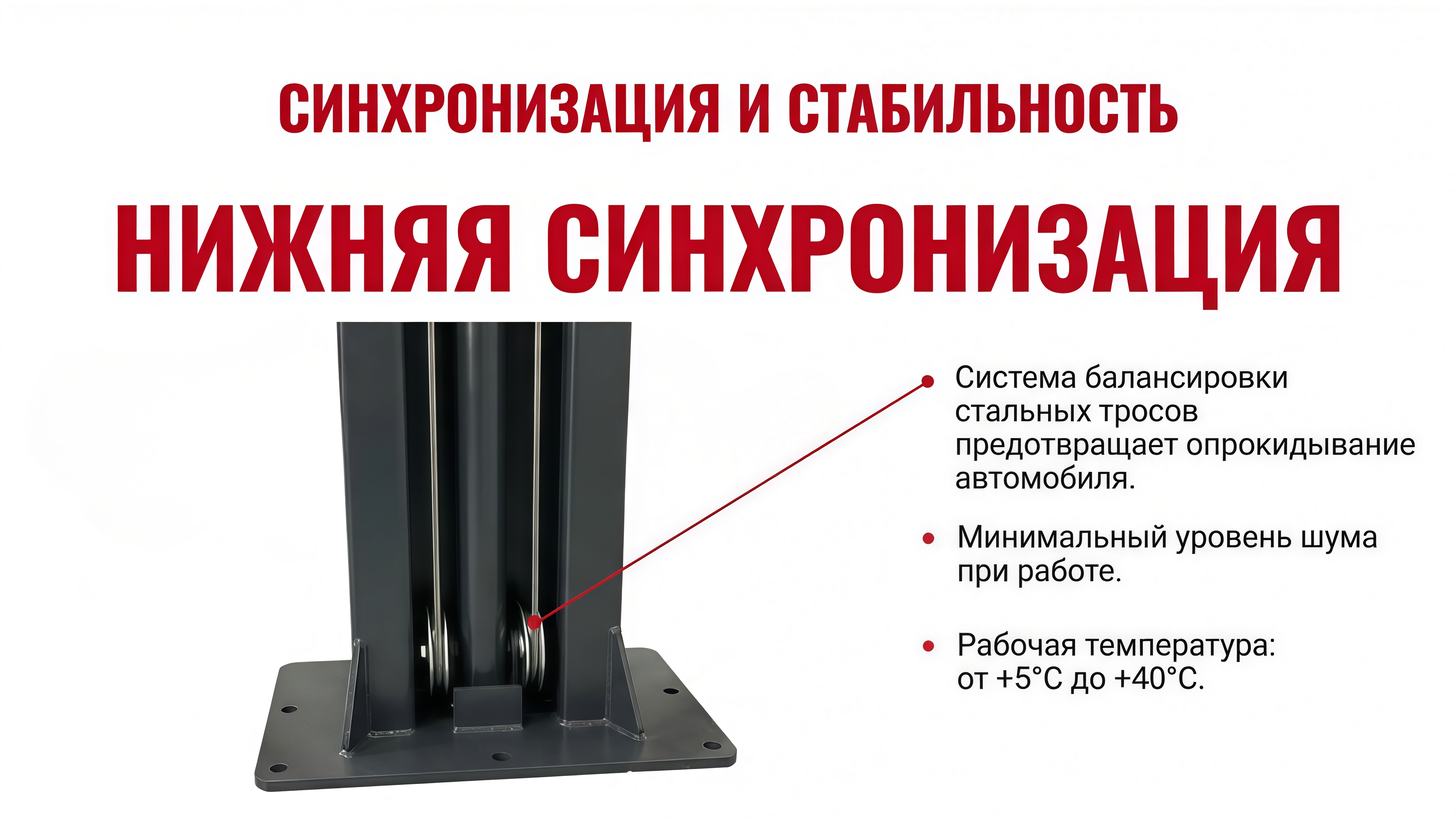 Одной из главных особенностей этого подъемника является разблокировка стопоров на каждой колоне. Это позволяет быстро и безопасно выпустить стопора и осуществить опускание автомобиля. Благодаря отличной системе нижней синхронизации стальных тросов подъем и опускание происходят плавно и практически бесшумно.