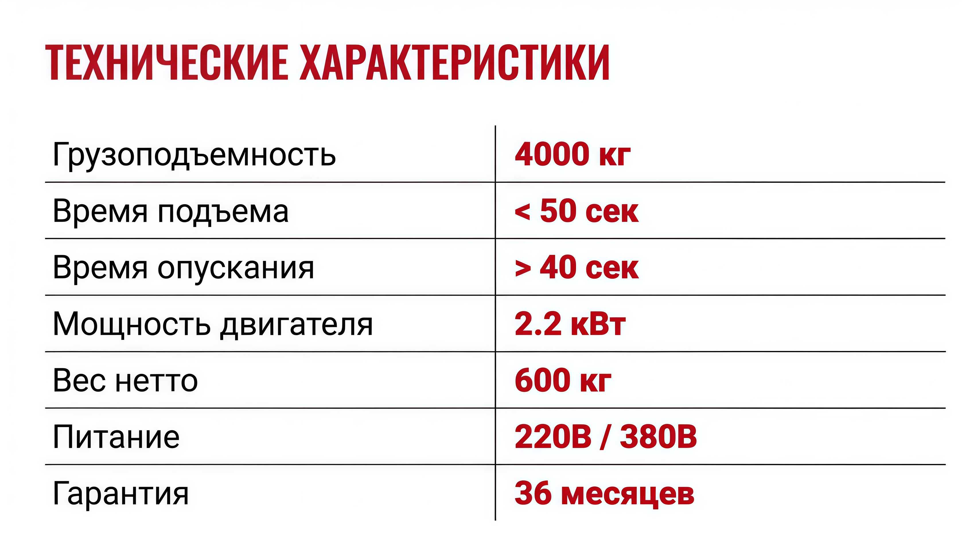 | Тип подъемника | Электрогидравлический |