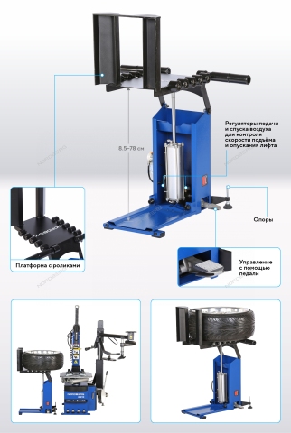 Пневматический подъёмник, предназначенный для вертикального подъёма и перемещения колёс. Работает от системы сжатого воздуха и используется для установки колеса на рабочую поверхность шиномонтажного станка с минимальной физической нагрузкой на оператора.