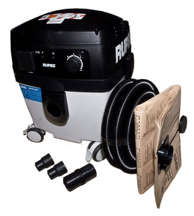 RUPES S 130L — малогабаритный мобильный пылесос класса L для работы с электрическим шлифовальным инструментом. Оснащен функцией автоматического включения и выключения от машинки и регулировкой мощности от 780 Вт до 1200 Вт. Применяется для забора пыл, возникающей в процессе зачистки и шлифовальных работ, а также других видов промышленных процессов, сопровождающихся образованием пылевидных загрязнений. Пылесос S130L рассчитан на подключение только электрического инструмента.