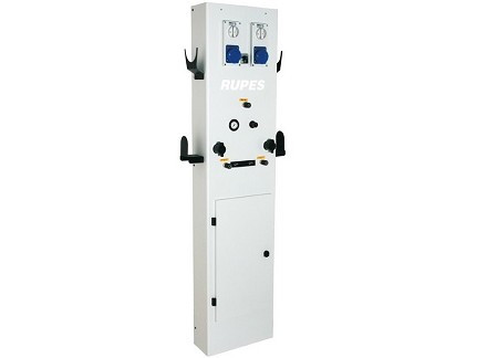 Rupes PT 202A - Многофункциональный настенный терминал для централизованных систем пылеудаления: размеры 220x600x1800мм, манометр с регулятором воздуха, электропитание 220-230В/50Гц, 2 электрические розетки для подключения электроинструмента, 2 разъема для подключения пневмомашинок (воздух со смазкой), 2 разъема для подключения к очищенному сухому воздуху, по 2 кронштйна для шлангов и инструмента, двойной соединитель для шлангов Ø29 мм, дополнительные нишы для хранения расходных материалов и инструментов.