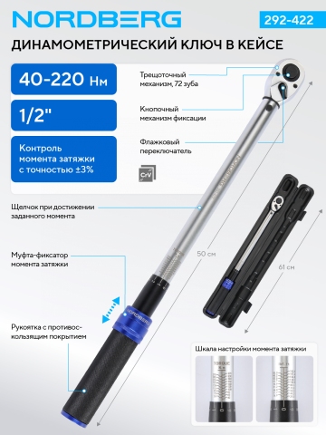 NORDBERG 292-422 — надёжный и точный динамометрический ключ для профессионального использования. Идеально подходит для автосервисов, СТО, ремонтных мастерских и монтажных работ, где требуется контроль усилия затяжки и безопасность соединений.