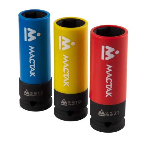 Головки с пластиковой защитой изготовлены специально для работы на шиномонтажном участке. Тонкие стенки позволяют работать с крепежом легкосплавных и кованых колёсных дисков, где использование стандартных головок проблематично или недопустимо. Съёмная пластиковая втулка поможет защитить колёсный диск от возможных повреждений.