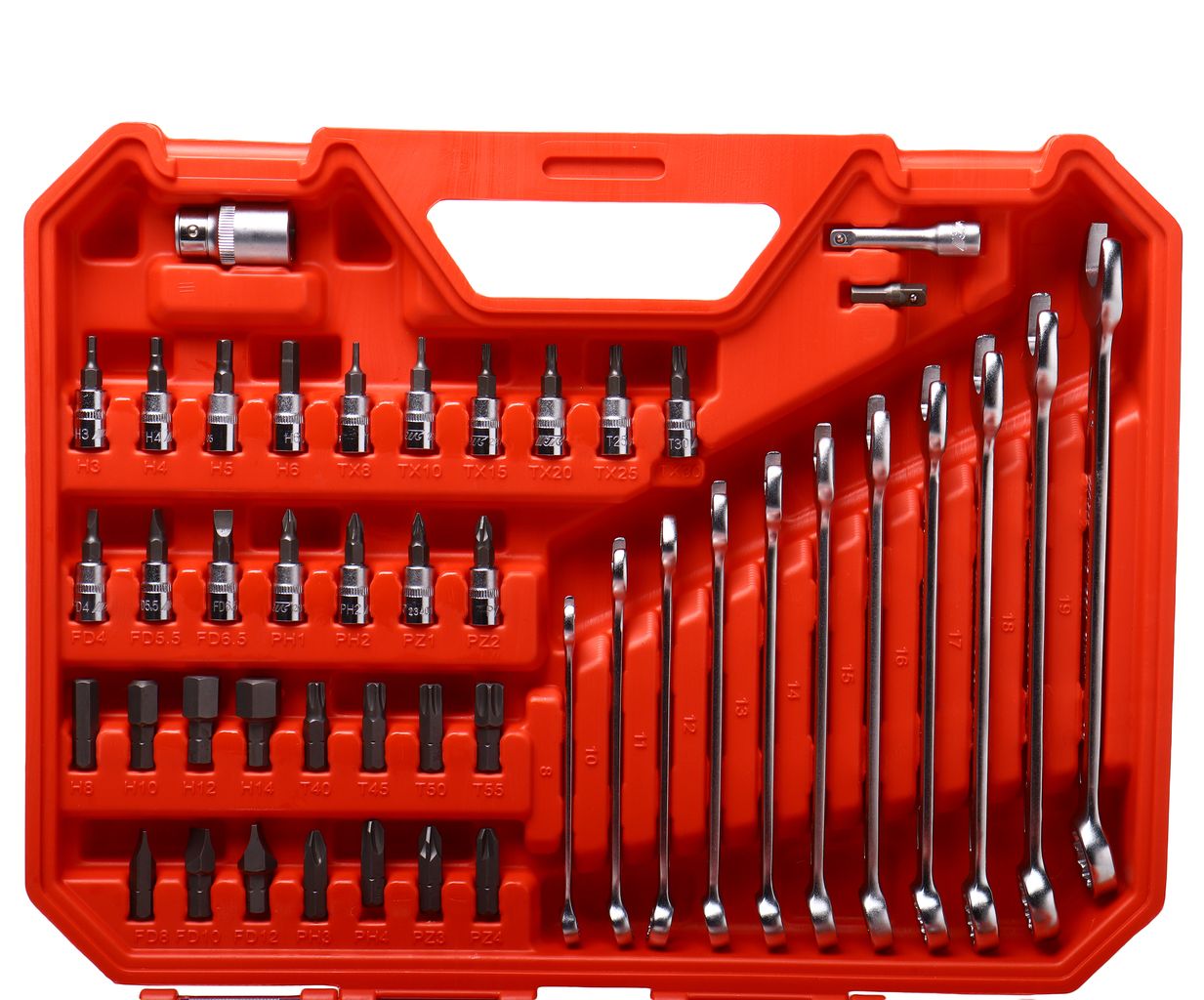 • 11 шт. ключ рожково-накидной: 8, 10, 11, 12, 13, 14, 15, 16, 17, 18, 19 мм.