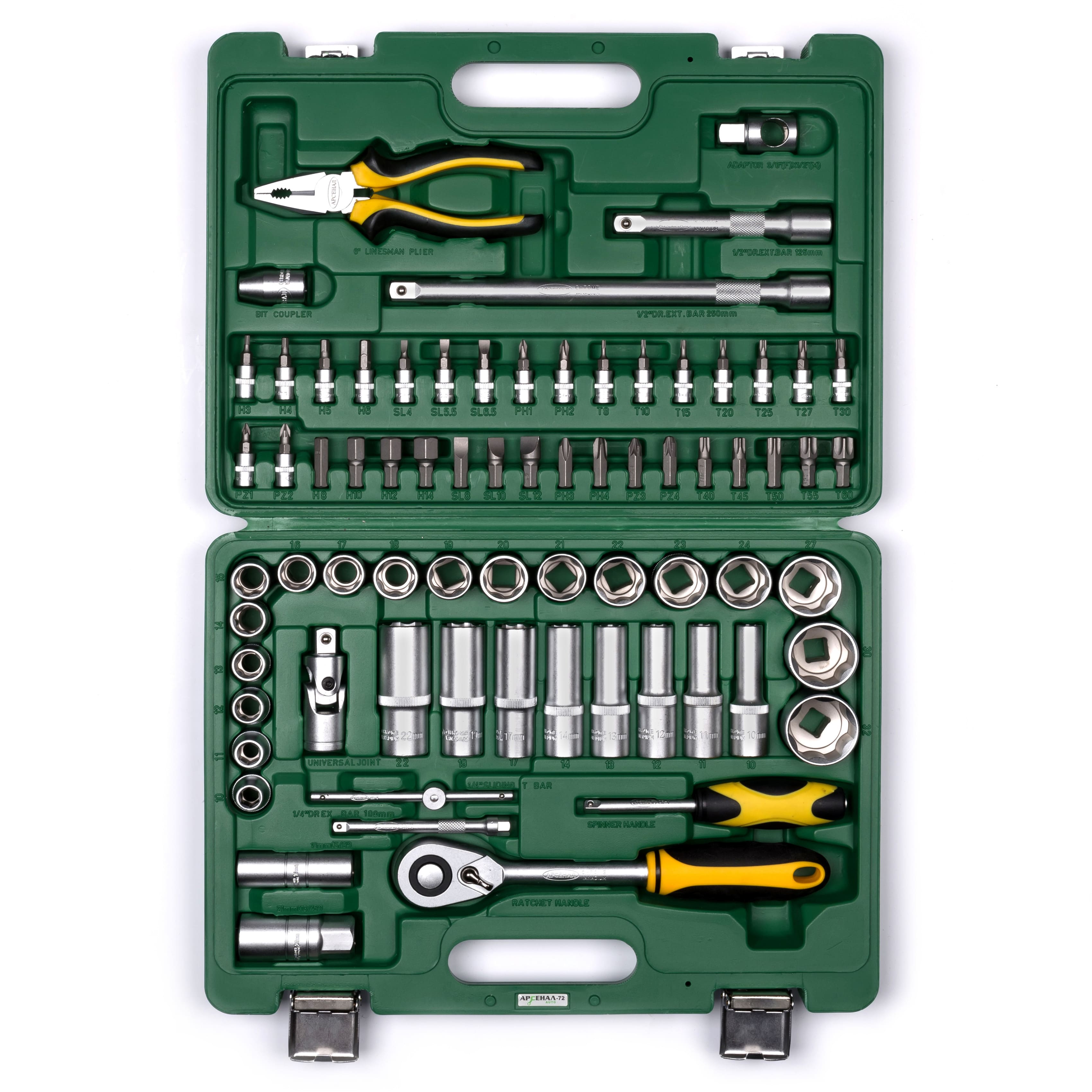 Набор инструментов 72 предмета AUTO Арсенал AA-C1412L72 подходит для самостоятельного ремонта и обслуживания личного автомобиля. Широкий ассортимент бит позволяет работать практически со всеми видами крепежа. Сталь, из которой изготовлен инструмент, легирована хромом и ванадием с нанесением никелевого покрытия. Крепкий кейс из ударопрочной пластмассы. Наборы инструментов Арсенал имеют пожизненную гарантию. Арсенал - всегда качественный инструмент и надежные кейсы.