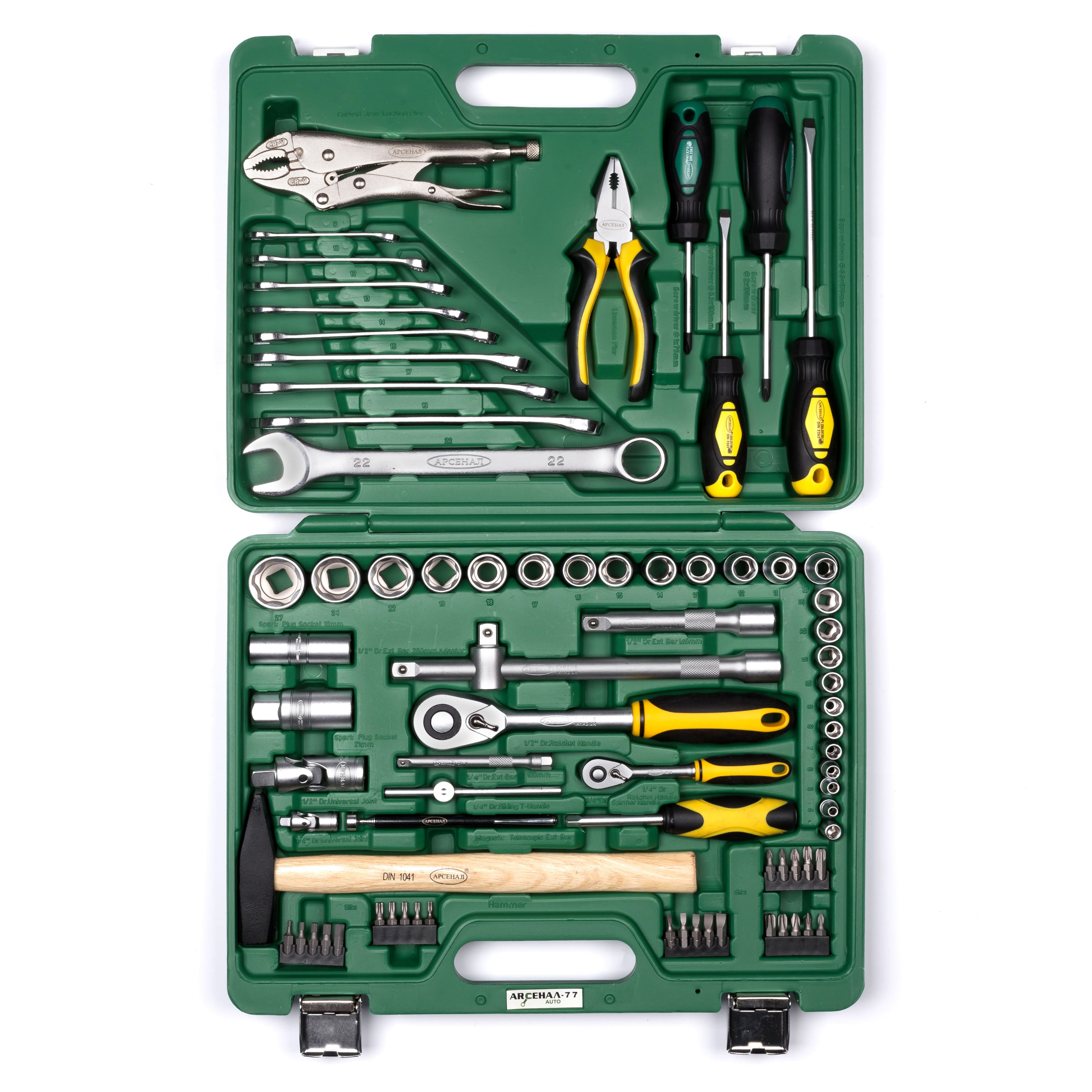 Набор инструментов 77 предметов AUTO Арсенал AA-C1412L77 является серьезным помощником даже для самых трудных задач в области самостоятельного ремонта и обслуживания автомобиля. Грамотный подбор головок, ключей, отверток позволит ремонтировать автомобиль самостоятельно. Сталь, из которой изготовлен инструмент, легирована хромом и ванадием с нанесением никелевого покрытия. Крепкий кейс из ударопрочной пластмассы.