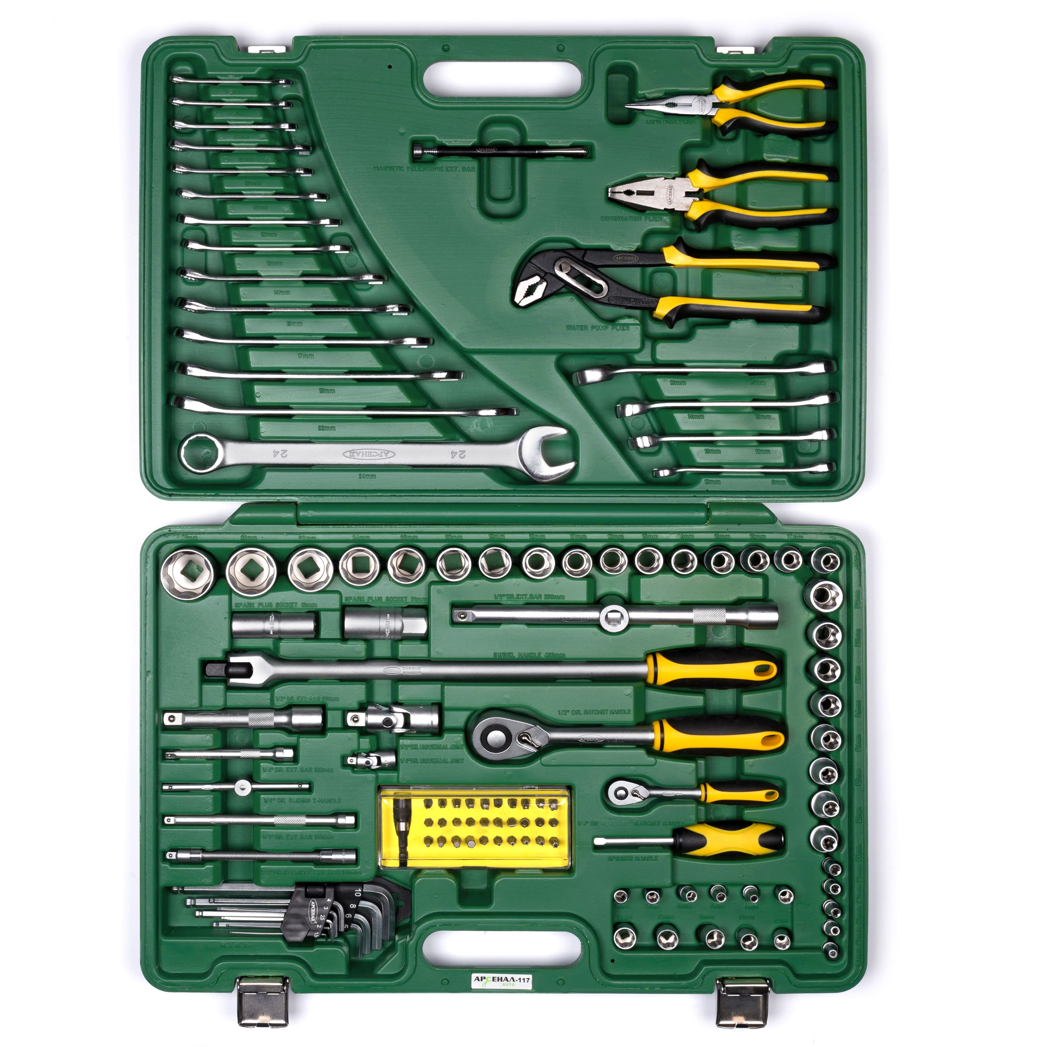 Набор инструментов 117 предметов Арсенал AA-C1412P117 подходит для тех, кому нужен большой выбор ключей и головок. В комплекте есть срывной вороток на 430 мм, а также ключи разрезные, набор бит в органайзере и большой подбор удлинителей. Сталь, из которой изготовлен инструмент, легирована хромом и ванадием с нанесением никелевого покрытия. Крепкий кейс из ударопрочной пластмассы. Наборы инструментов Арсенал имеют пожизненную гарантию.