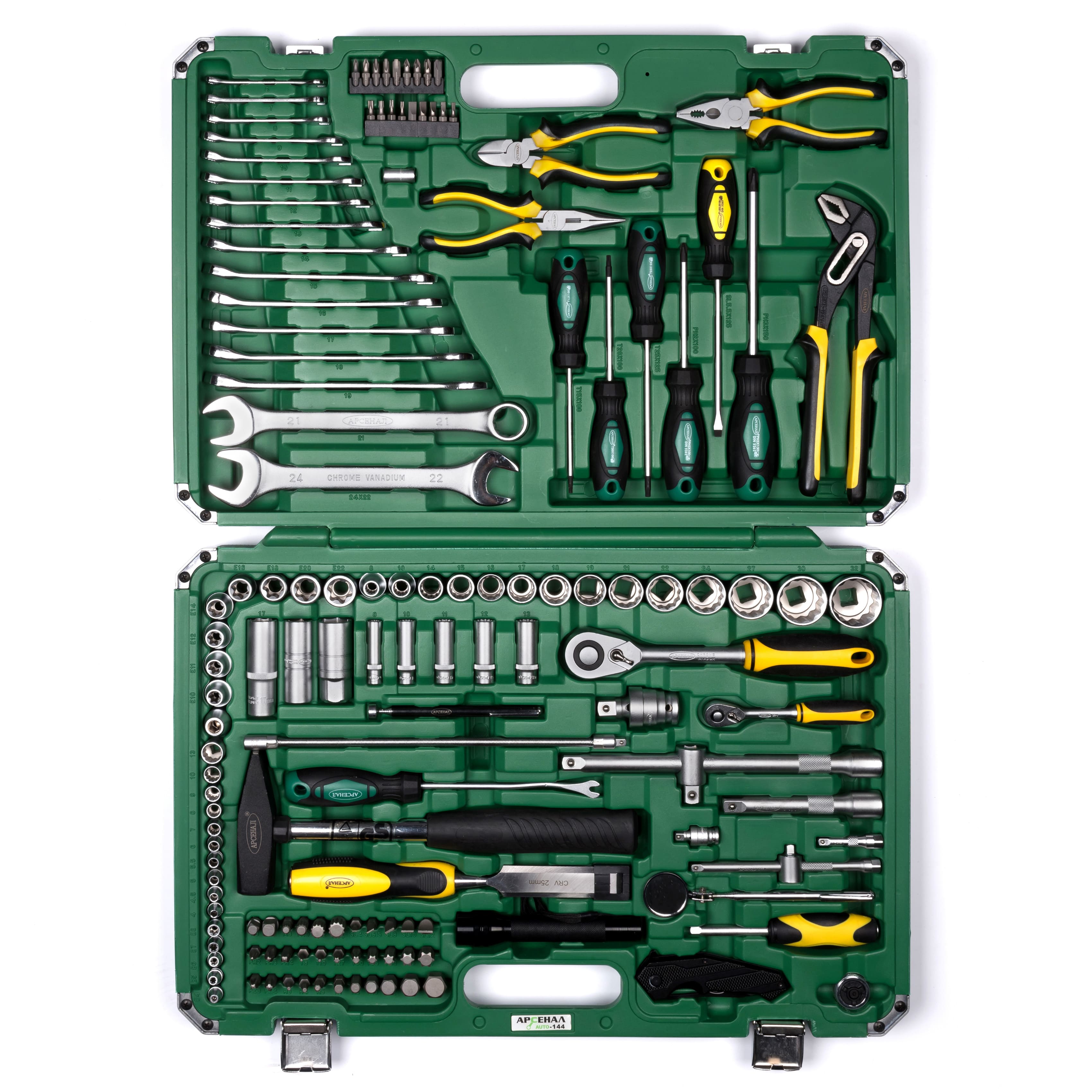 Набор инструментов 144 предмета Арсенал AA-C1412P144 разработан для профессионалов с упором на арматурные работы. Предложен широкий выбор шестигранных головок, большой ассортимент удлинителей и шарниров. Данный набор был создан на основе отзывов автослесарей. Сталь, из которой изготовлен инструмент, легирована хромом и ванадием с нанесением никелевого покрытия. Особопрочные кейсы с металлическими углами, усиленными петлями и стальными замками позволяют использовать набор даже в самих сложных рабочих условиях. Наборы инструментов Арсенал имеют пожизненную гарантию.