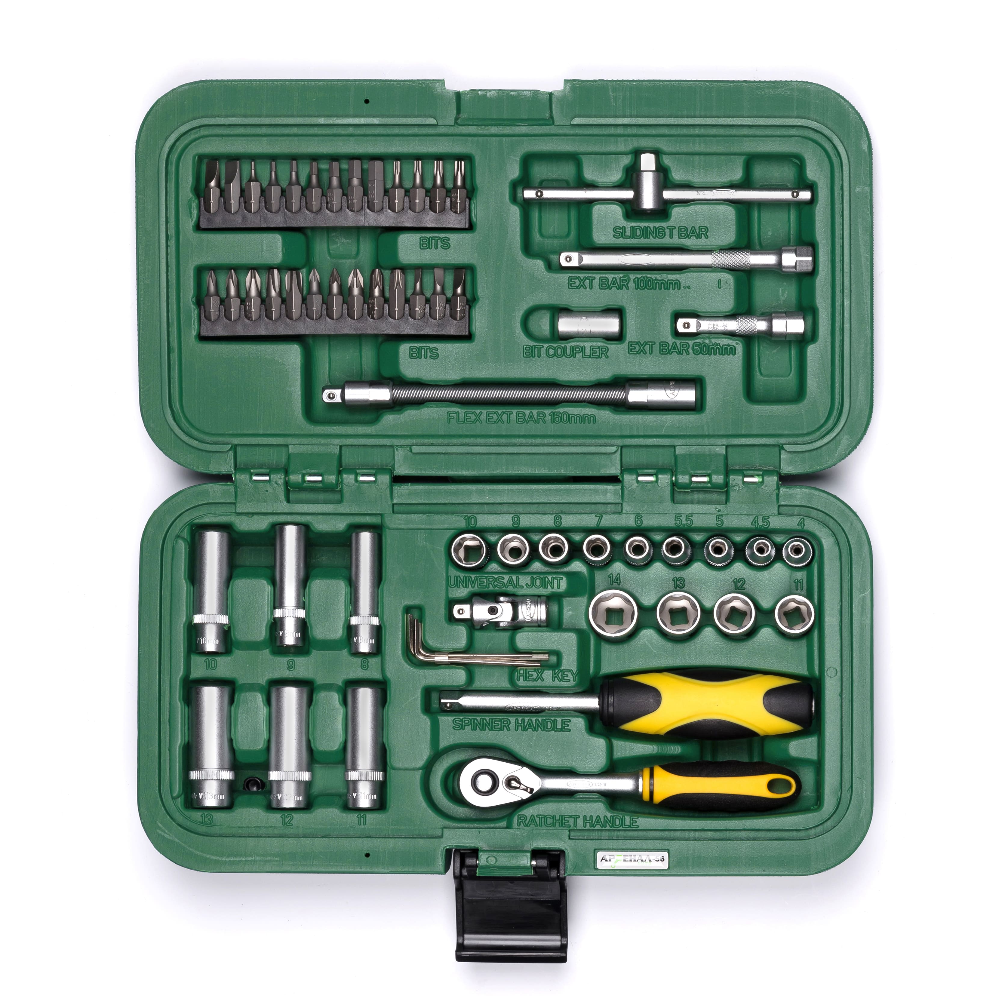 Набор инструментов 56 предметов Арсенал AA-C14L56 один из самых популярных наборов на 1/4 дюйма, подходит для самостоятельного небольшого ремонта личного автомобиля. Оптимальный подбор инструмента на одну четверть выручит при необходимости. Сталь, из которой изготовлен инструмент, легирована хромом и ванадием с нанесением никелевого покрытия. Компактный и крепкий кейс никогда не подведёт и долго прослужит даже при самых серьезных испытаниях. Наборы инструментов Арсенал имеют пожизненную гарантию.