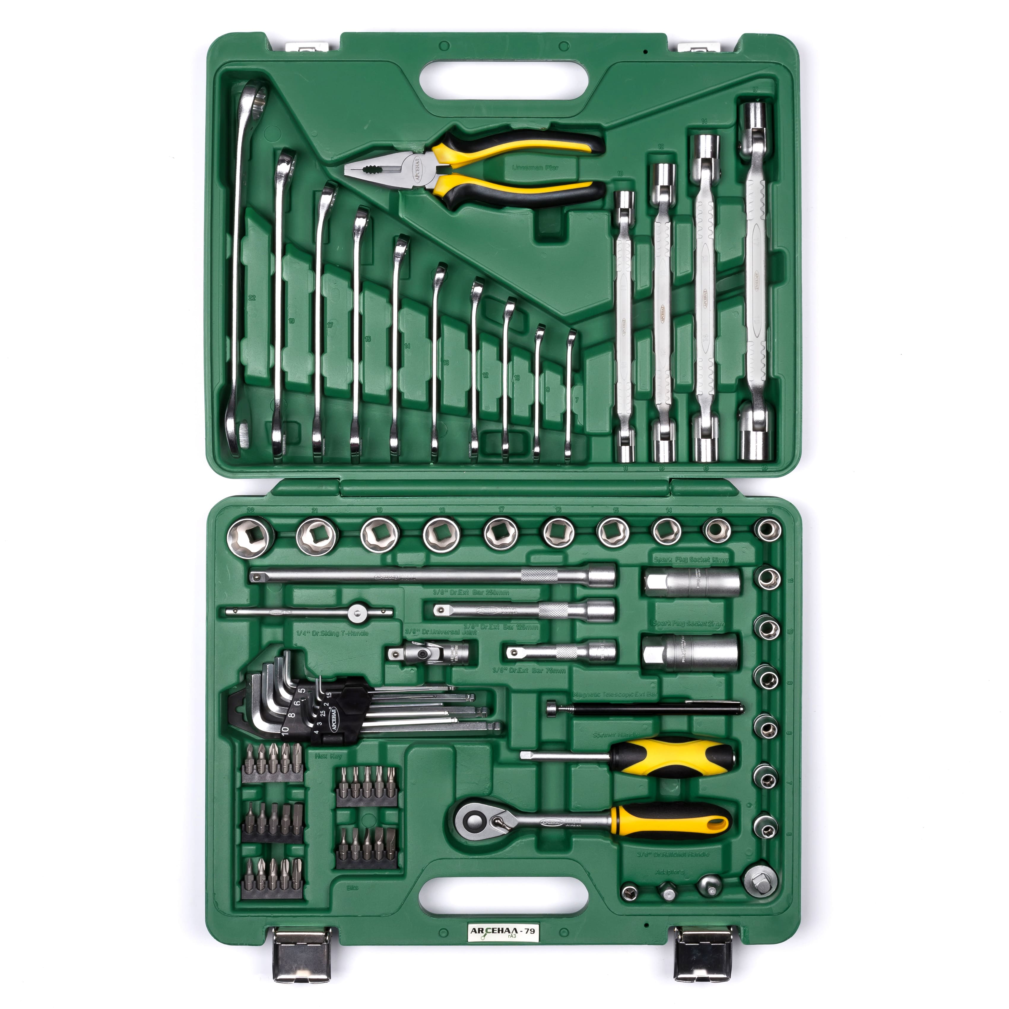 Набор инструментов 79 предметов Арсенал AA-C38UL79 имеет одну из самых широких комплектаций в размерном ряду 3/8 на российском рынке. Кроме головок, комплектуется большим количеством таких предметов, как ключи комбинированные, шестигранные и шарнирные, биты и большой ассортимент переходников. Сталь, из которой изготовлен инструмент, легирована хромом и ванадием с нанесением никелевого покрытия. Крепкий кейс из ударопрочной пластмассы. Наборы инструментов Арсенал имеют пожизненную гарантию. Арсенал - всегда качественный инструмент и надежные кейсы.