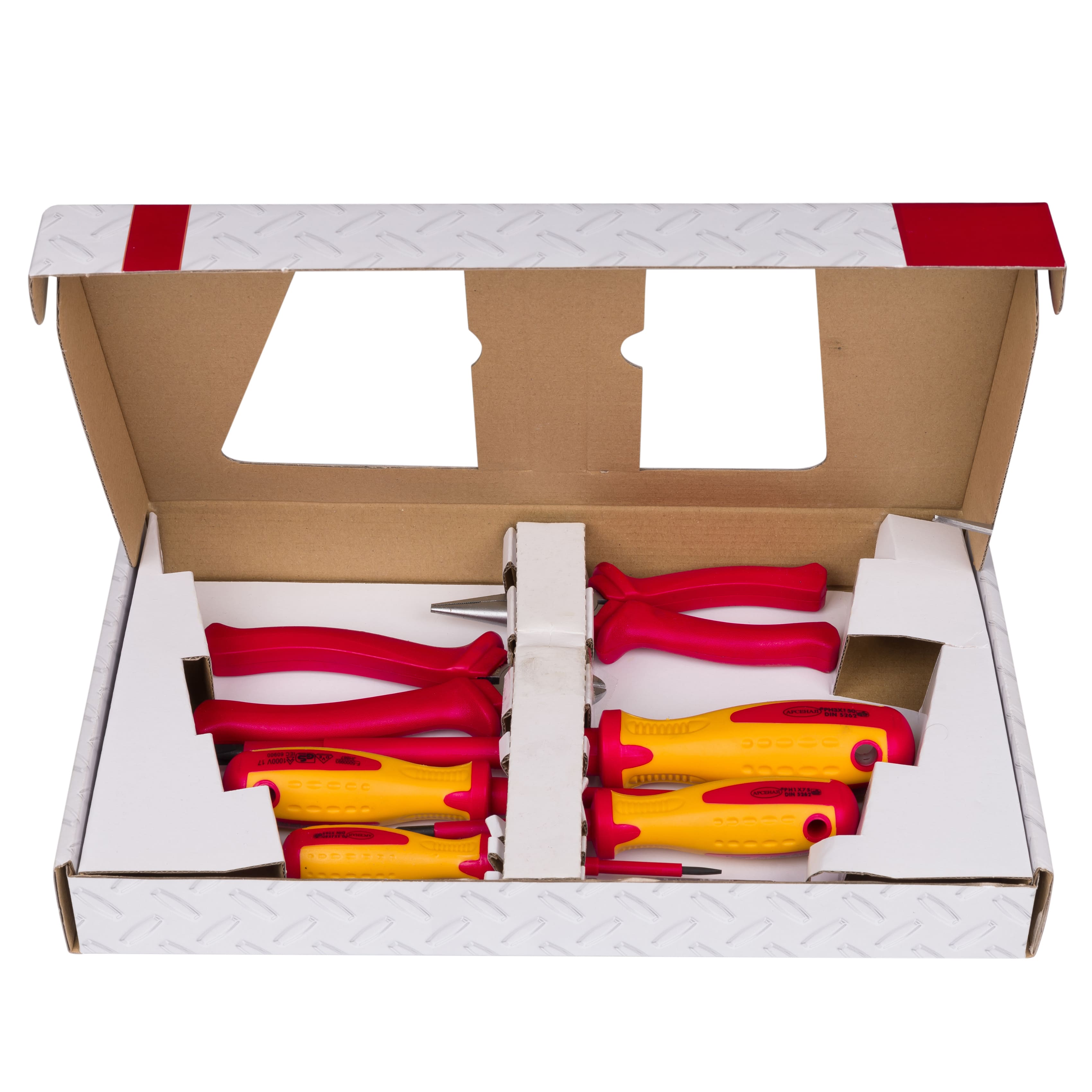 Набор диэлектрических отверток Арсенал НОЭ-7, 1042080 состоит из семи предметов и предназначен для производства профессиональных электромонтажных работ. В состав набора входят диэлектрические отвертки, способные работать под напряжением 1000 В, бокорезы и тонкогубцы для разрезания и обрезания проводов и автотестер для проверки напряжения в сети.