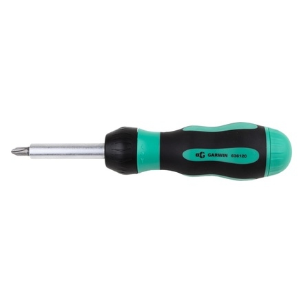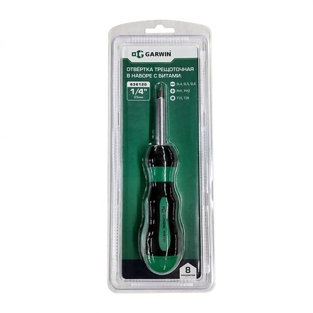 Отвертка трещоточная с поворотной ручкой и сменными битами GARWIN PRO 636120. Рабочие профиль бит в комплекте - PH (крест), SL (шлиц), Torx.